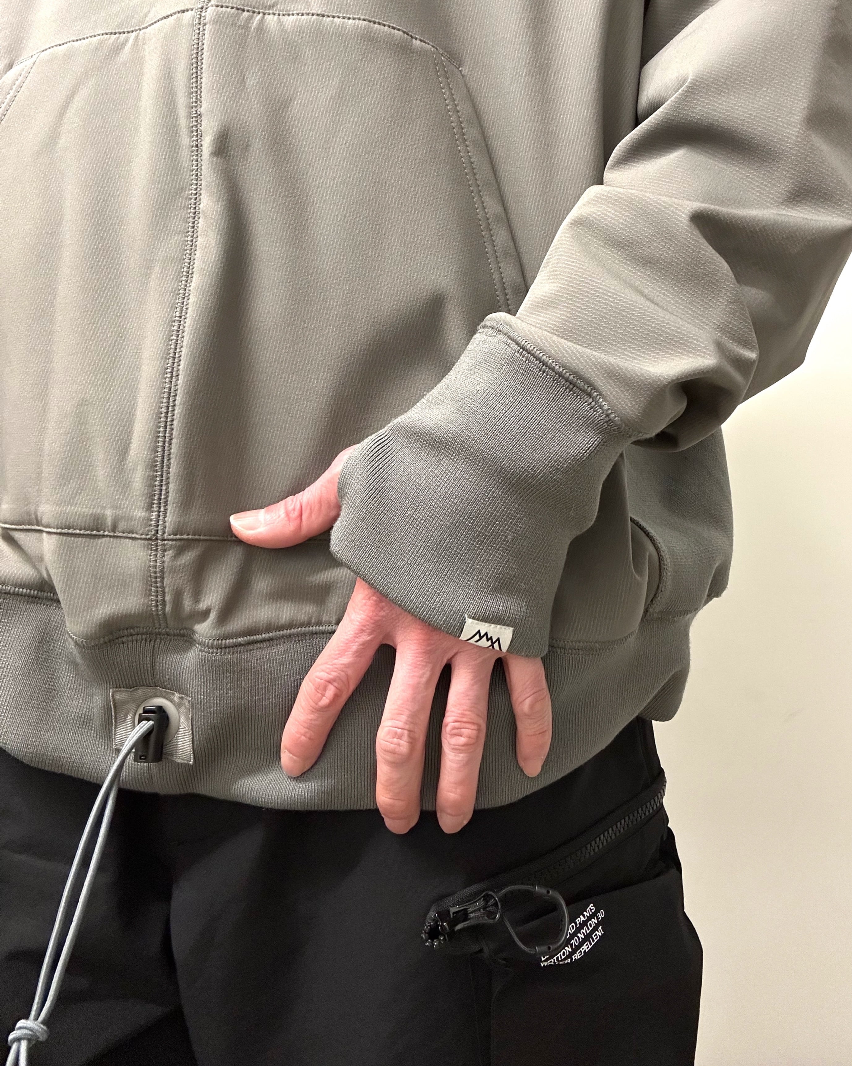 BODY裾部分に、BODY両脇に大きめのポケットと身幅の調節できるドローコード付き。