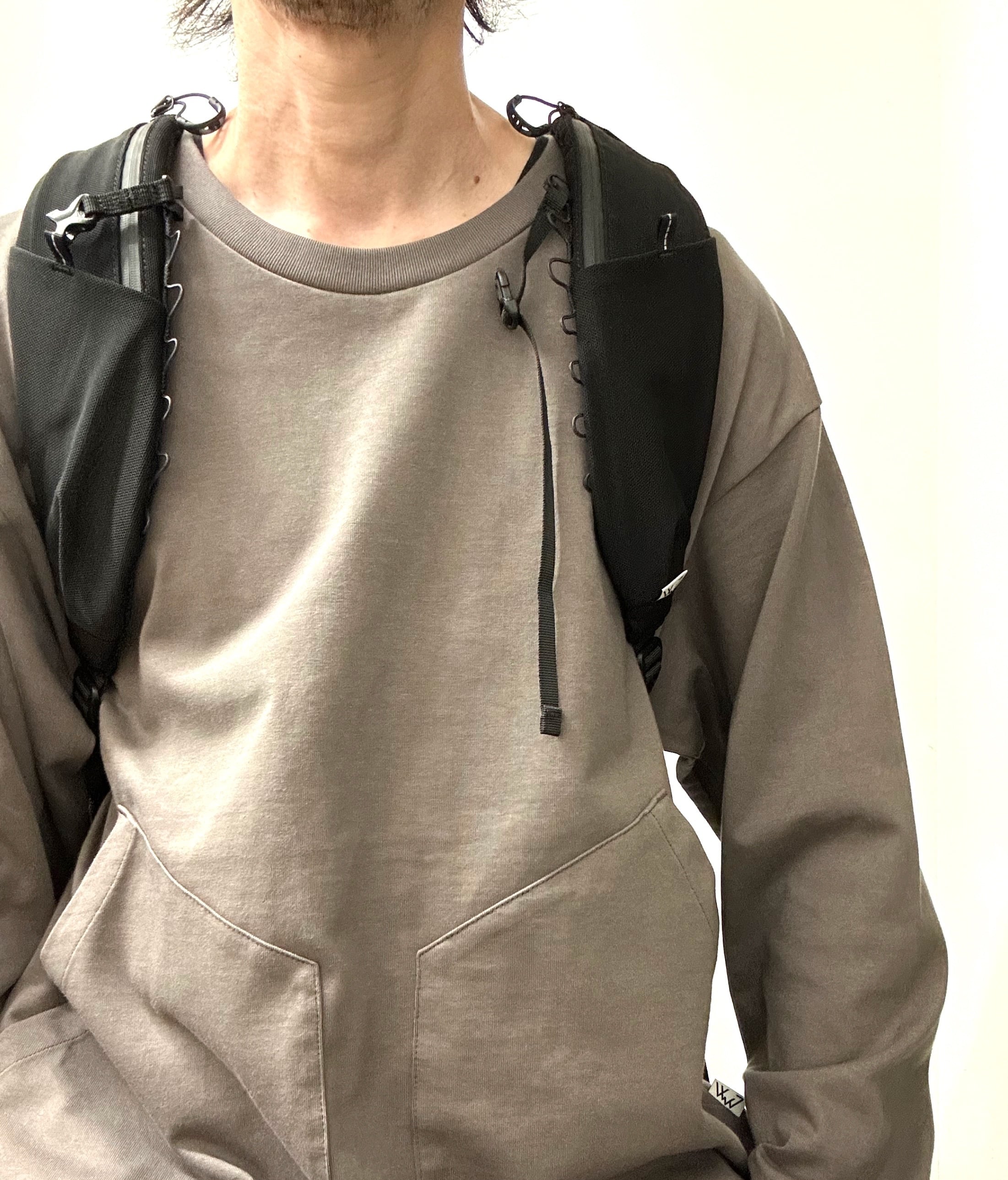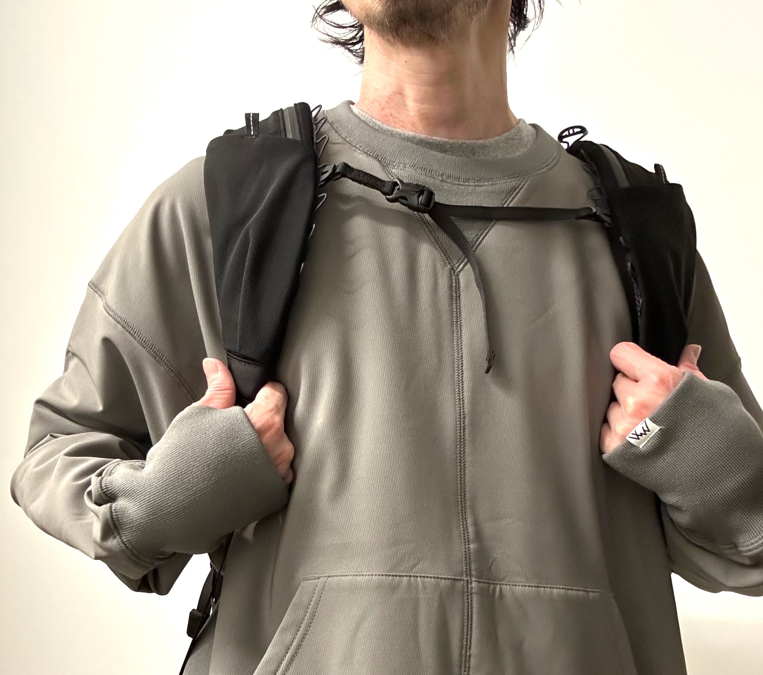ショルダーハーネス部分をさらに追及し、携帯やエアポッド用ポケット・ペットボトルのドリンクホルダー用ポケットを一体化した。