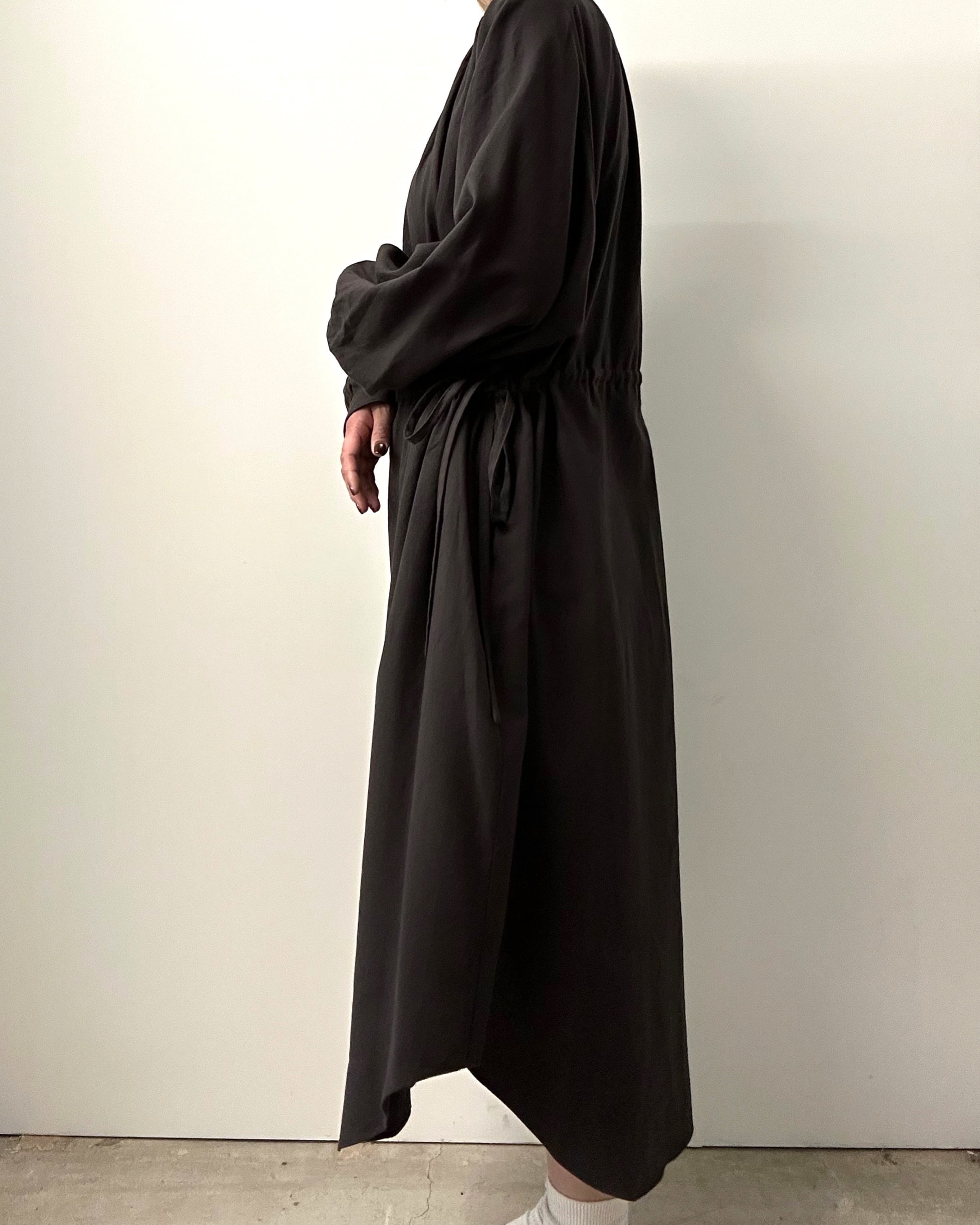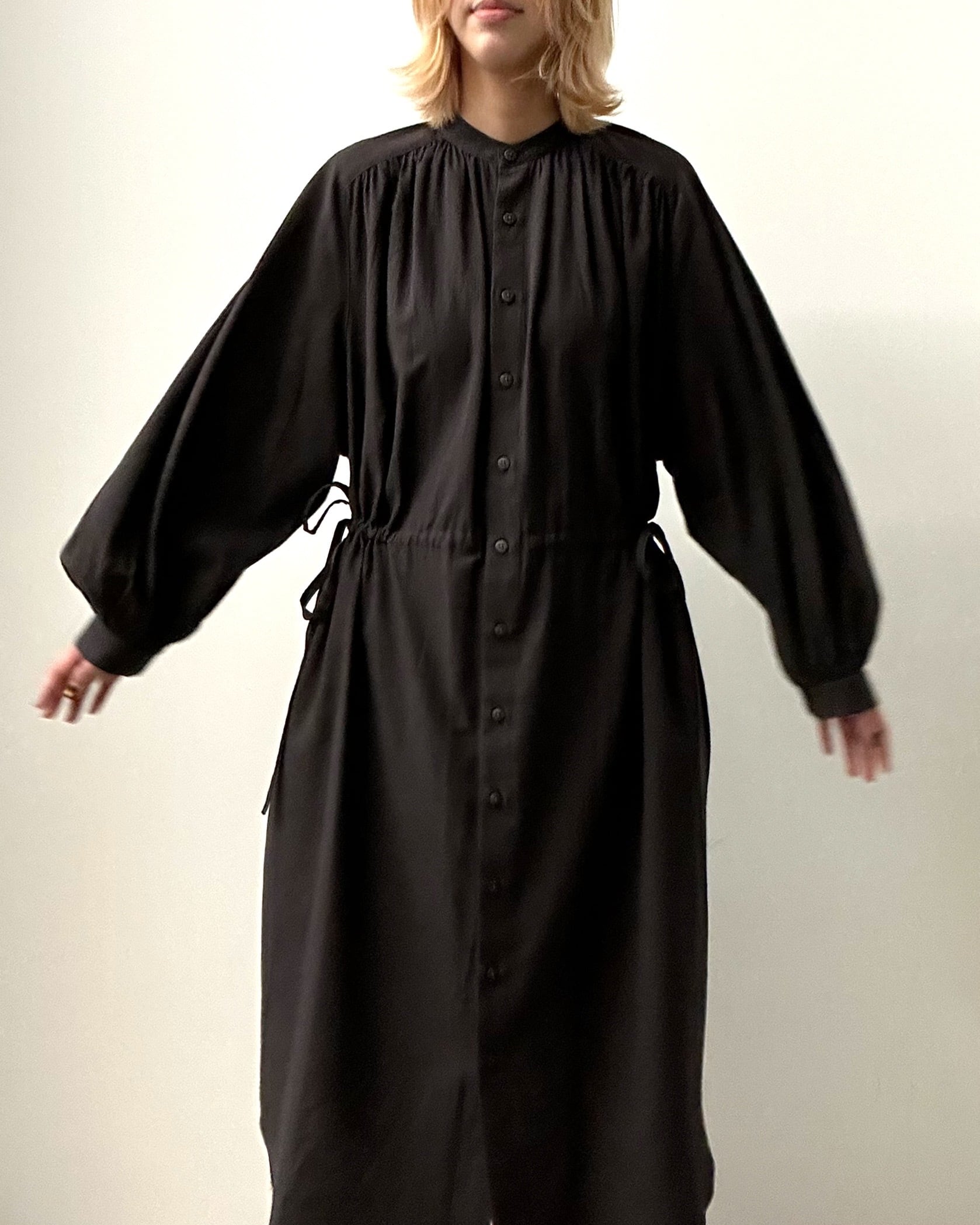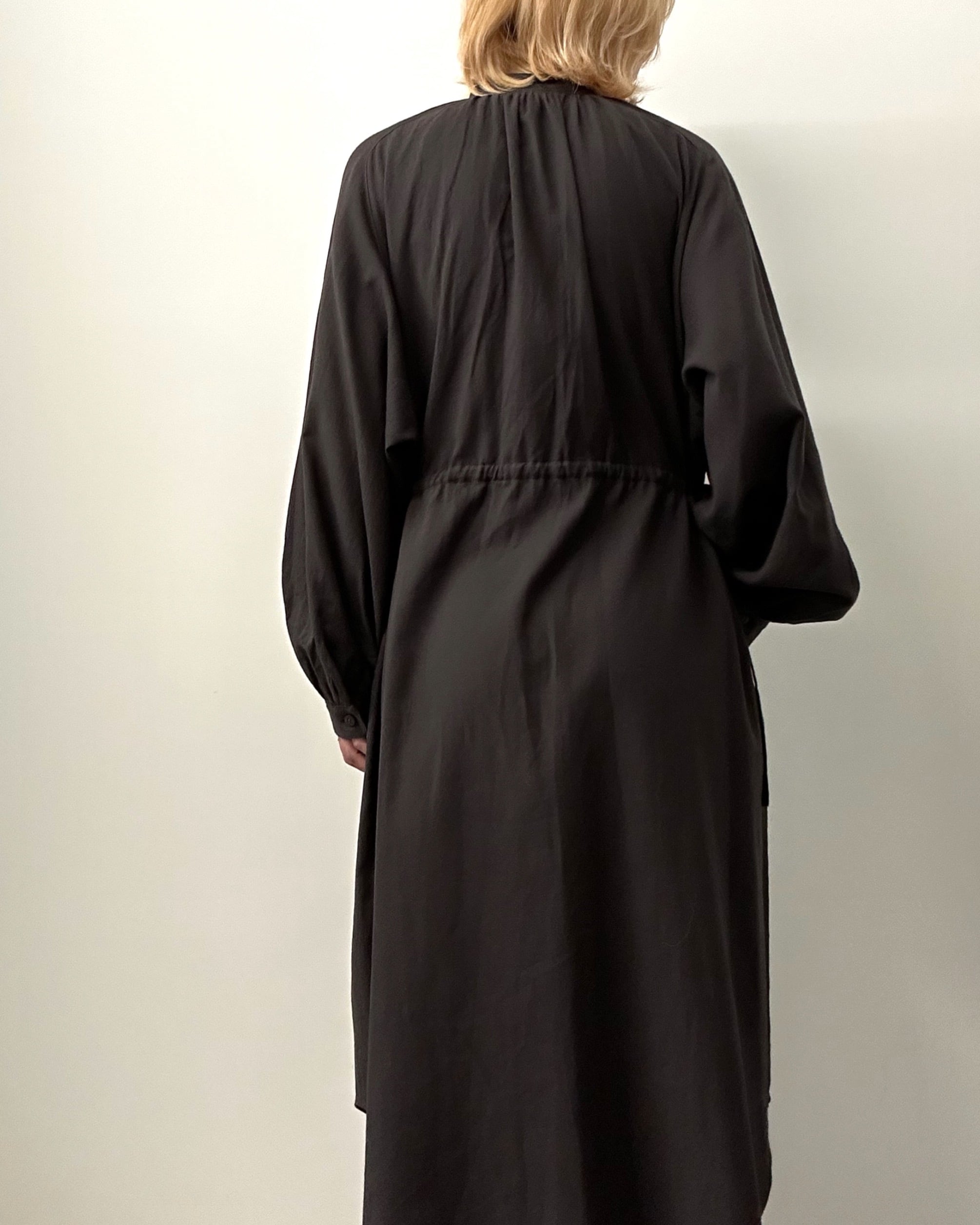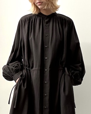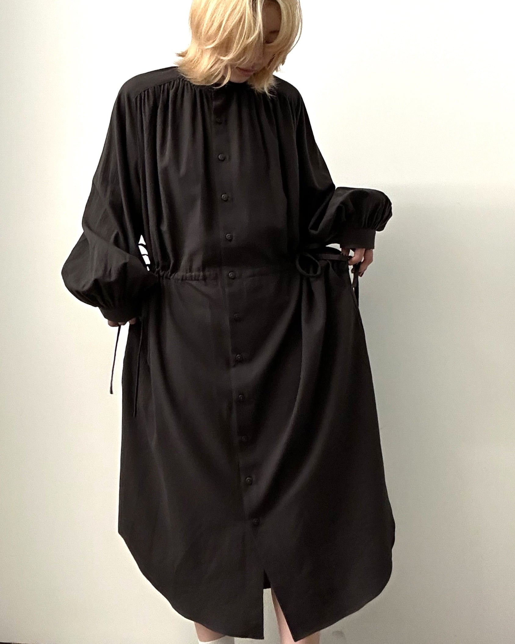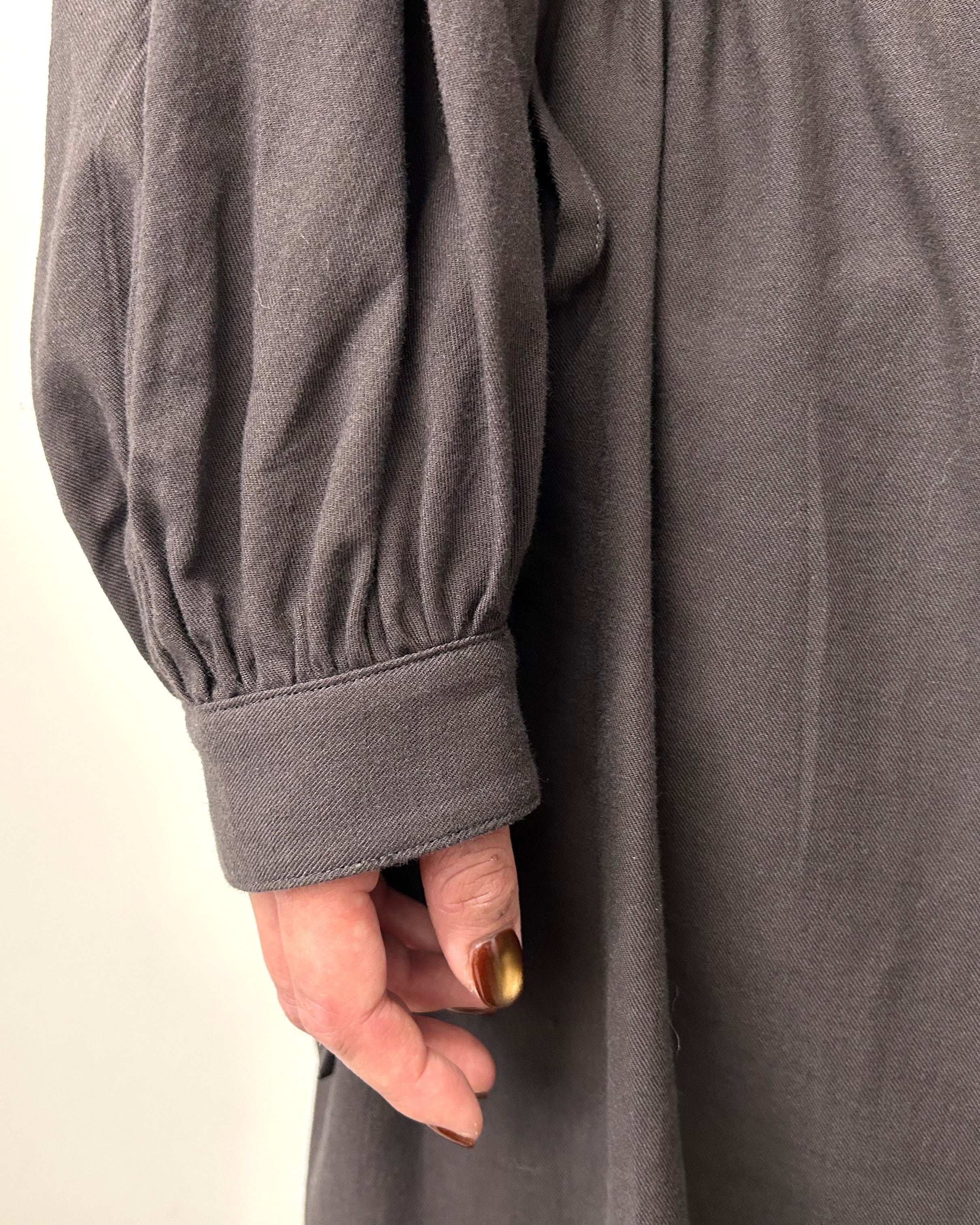インド綿にカシミヤを5%混紡することで、ほんのりしっとりとした触 感が加わったシャツ用ビエラ生地を使用し、襟元、背中、袖口、ウエストにたっぷりとギャザーを寄せたシャツドレスを製作。ウエストに共布スピンドルを通すことで、シルエットが大胆に変えられるのもこのシャツドレスの特徴です。 通年着用できる、とても雰囲気 のあるアイテムです。
