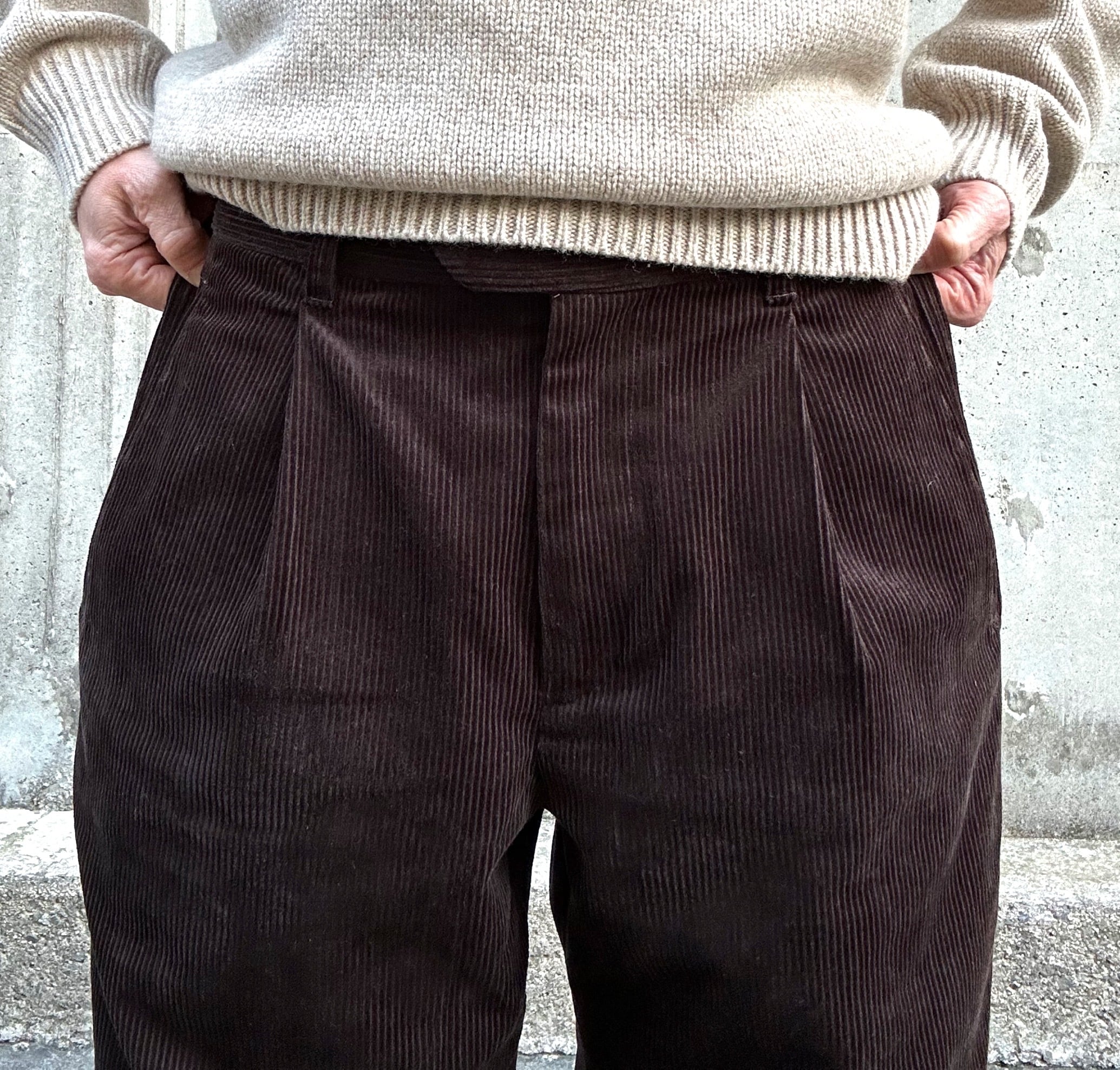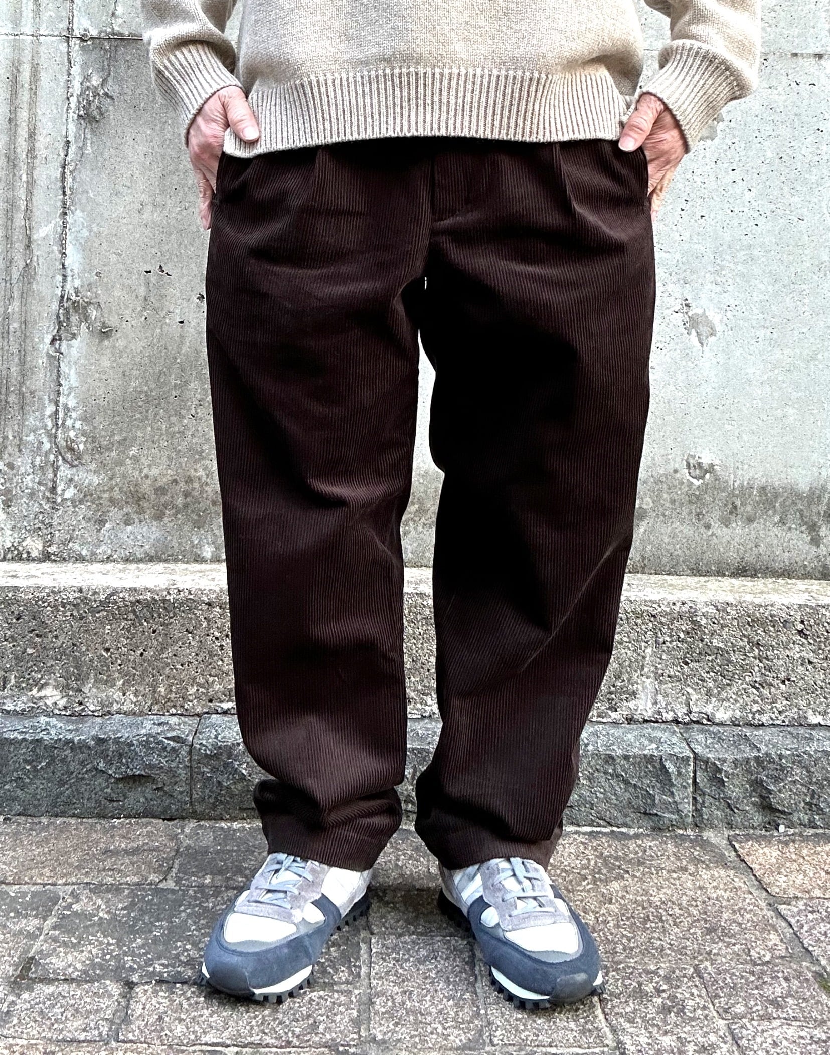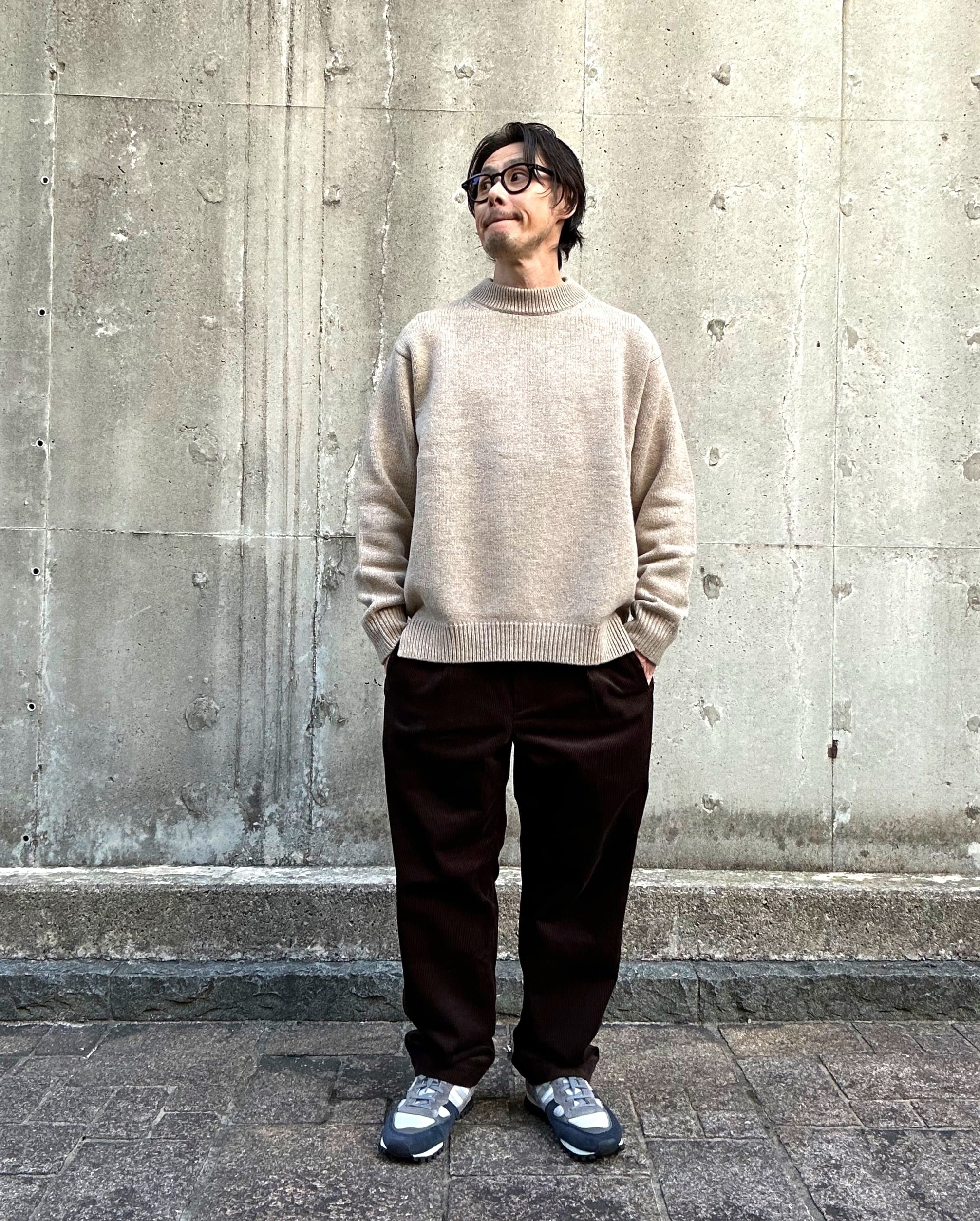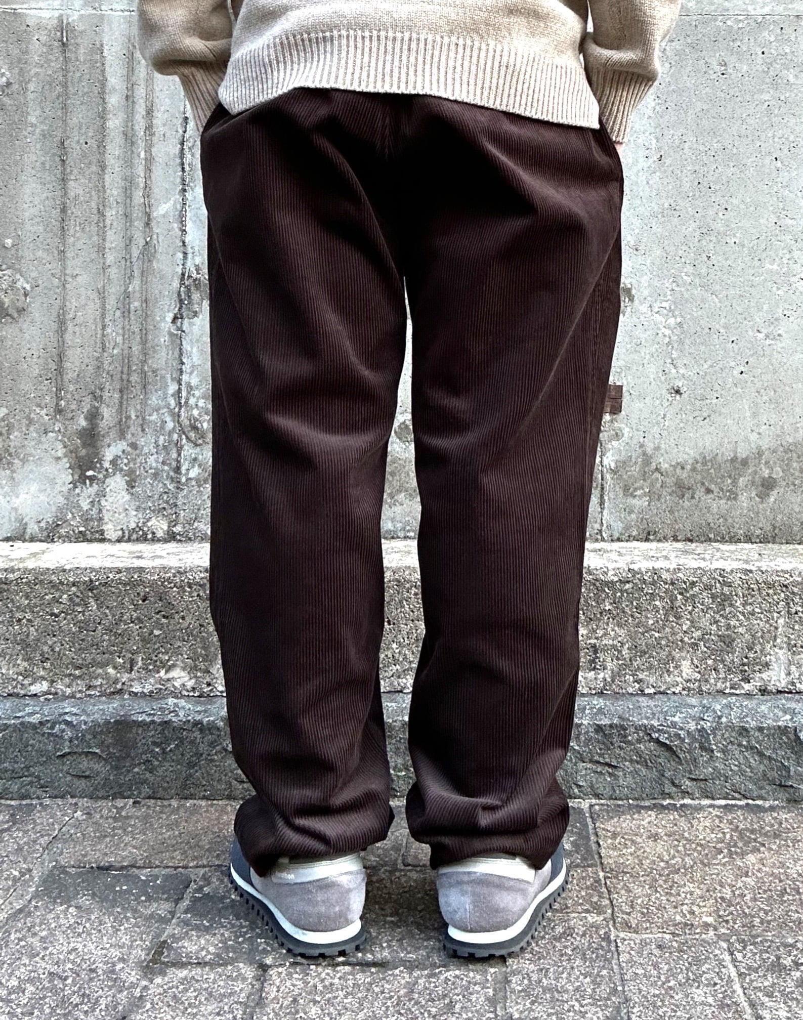今回 はオーガニックコットン100%、世界基準の GOTS認証をクリアしている素材を使用し、8Wコーデュロイを織りあげました。オー ガニックならではの芯まで柔らかく肌触 りの良い表面と、きめ細かな起毛感が ある、一段階上のコーデュロイパンツに仕 上がりました。それでもいつもの肉感と安心感はそのままキープしました。ひと冬着用できるアイテムです。