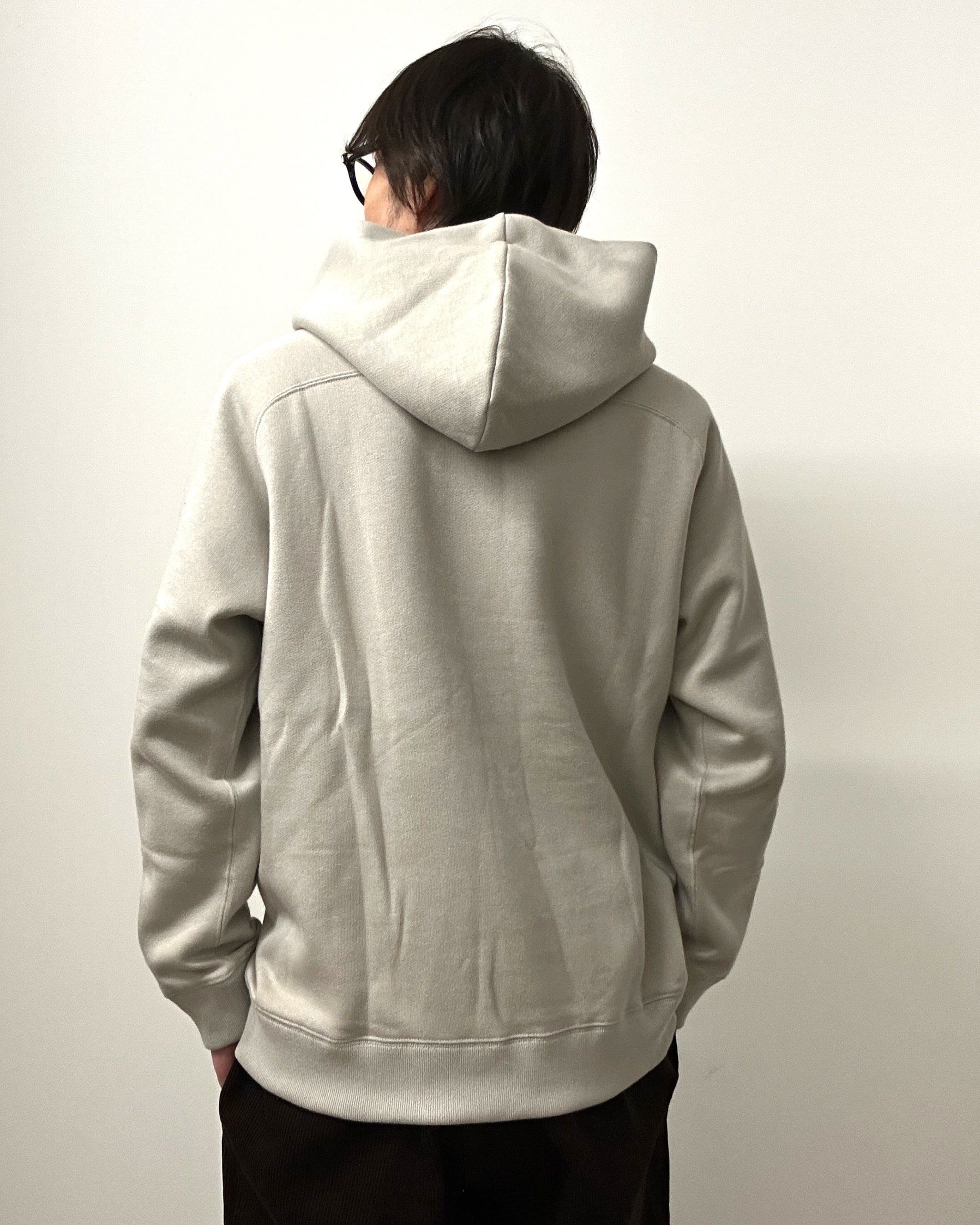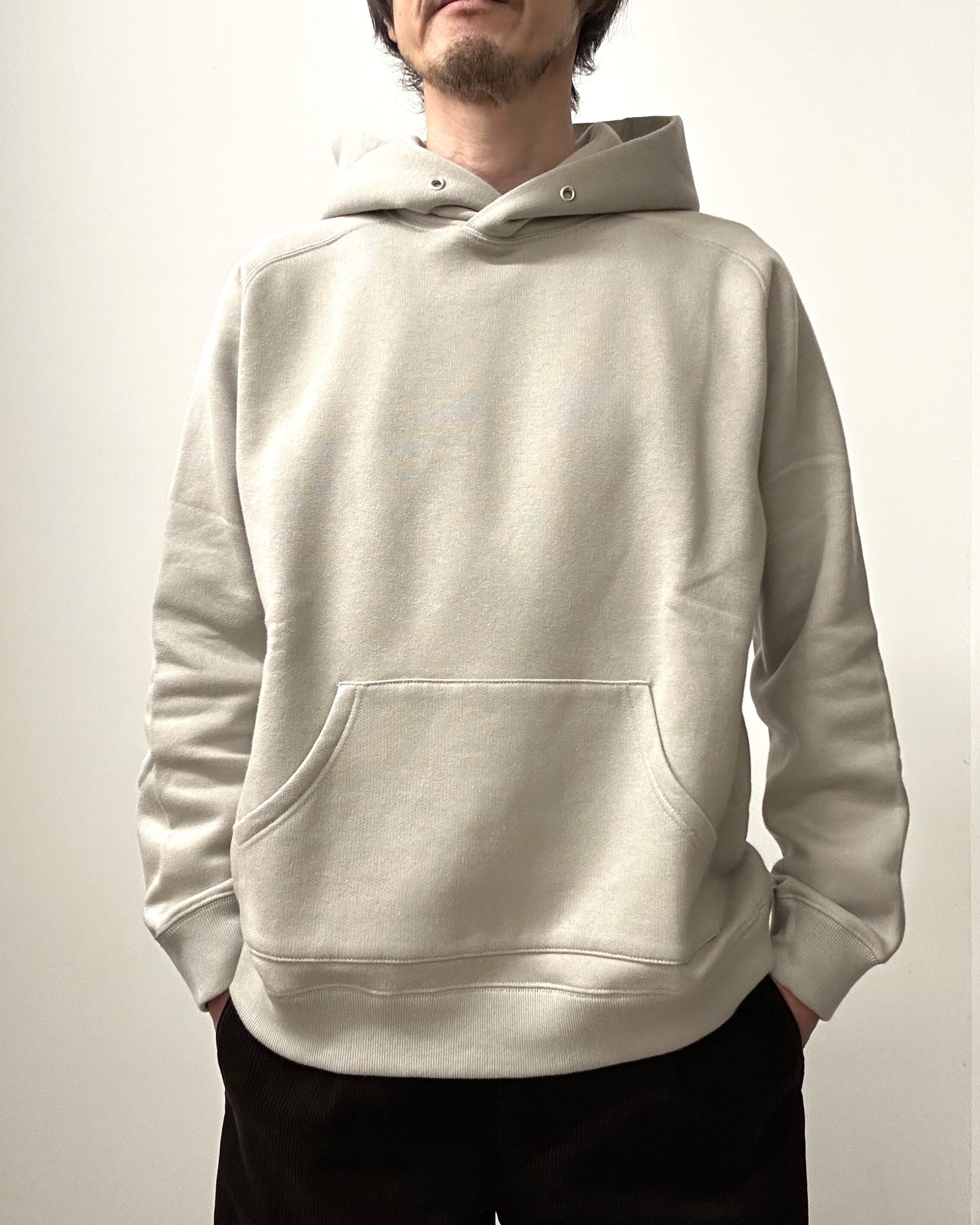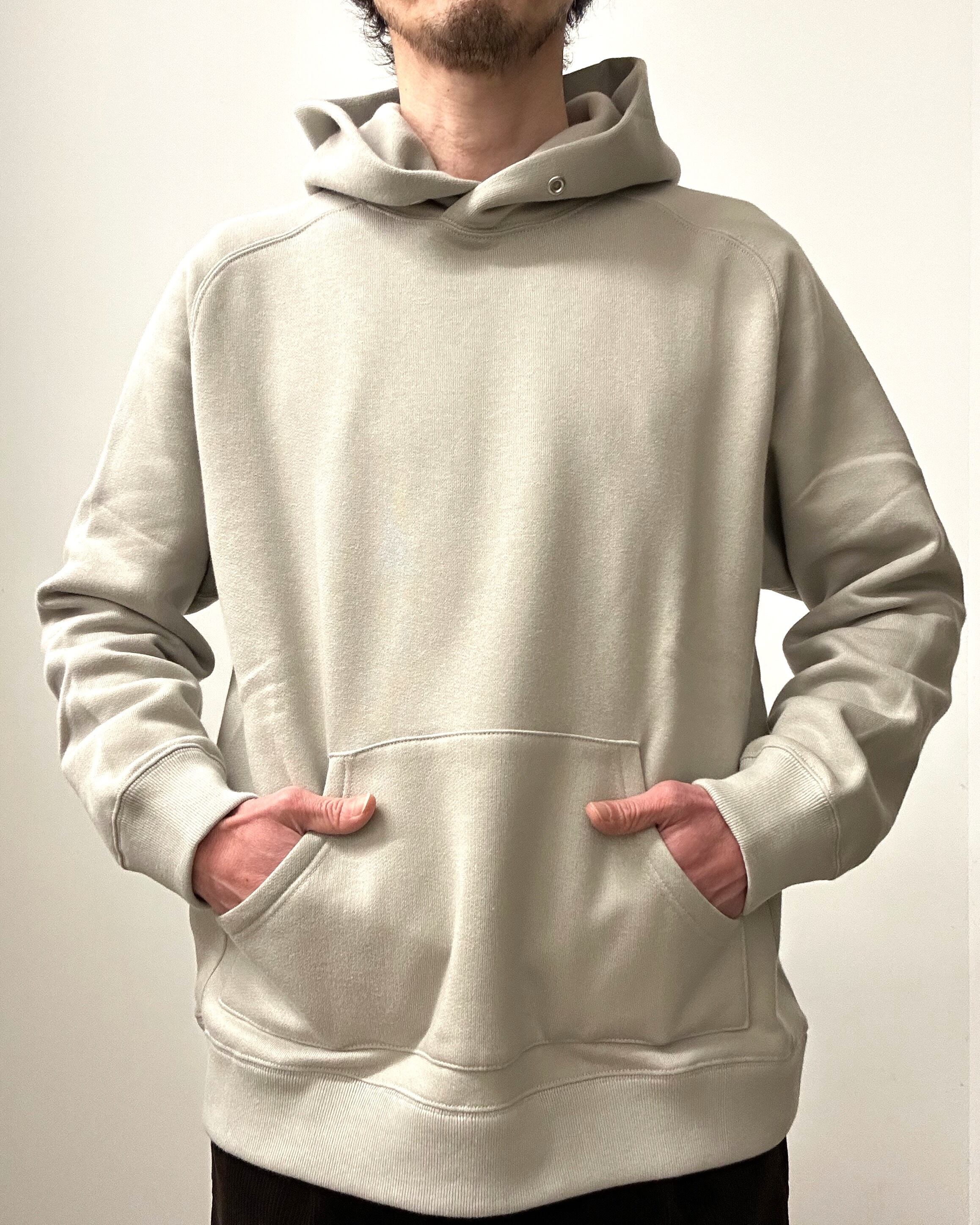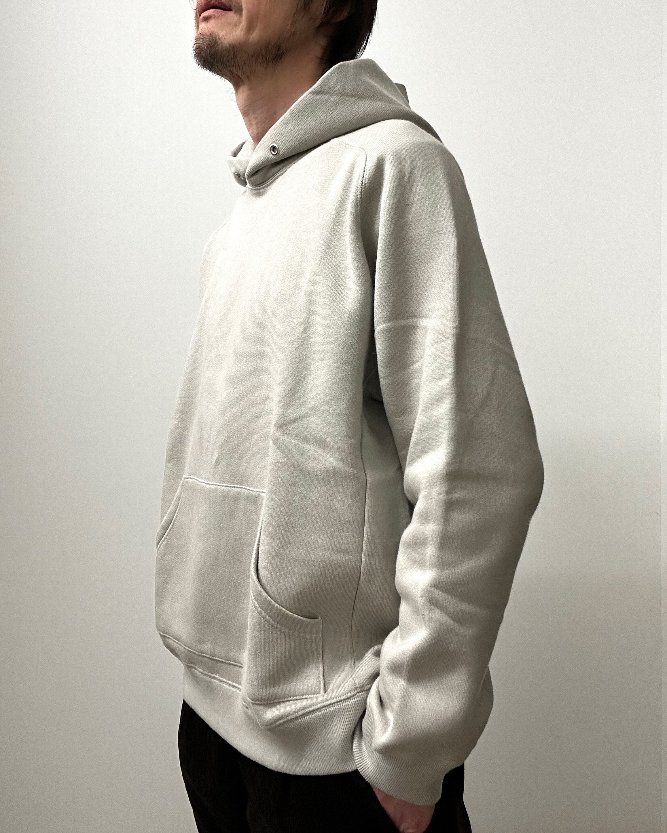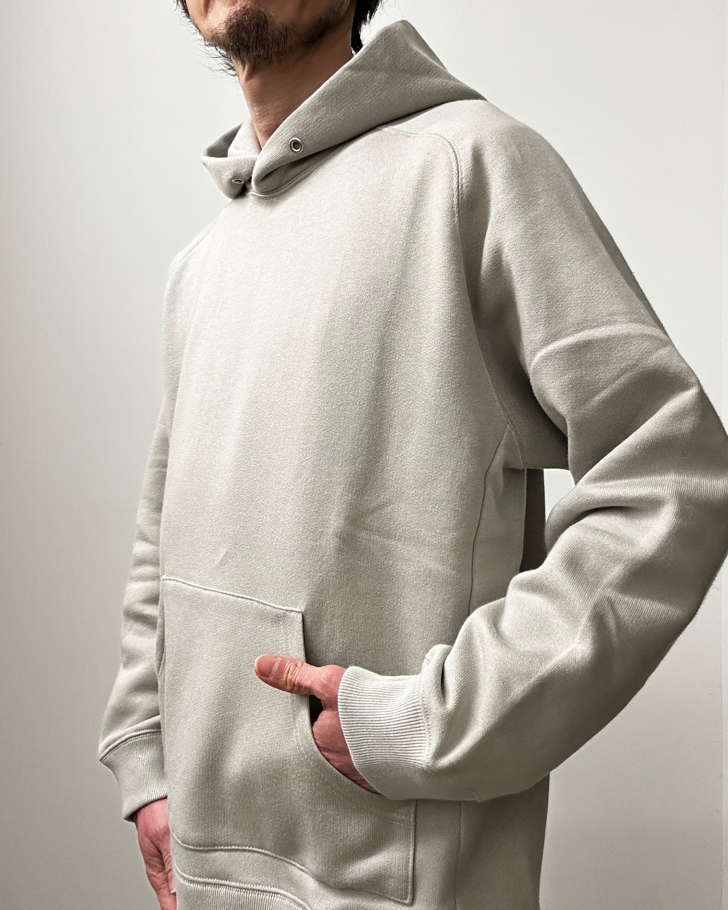 上記の加工を裏側(起毛側)のみに施しました。手触りがまるでシルクかカシミヤのようにサラサラ、モチモチ感じられる、驚きのラグランスリーブパーカとなっております。
