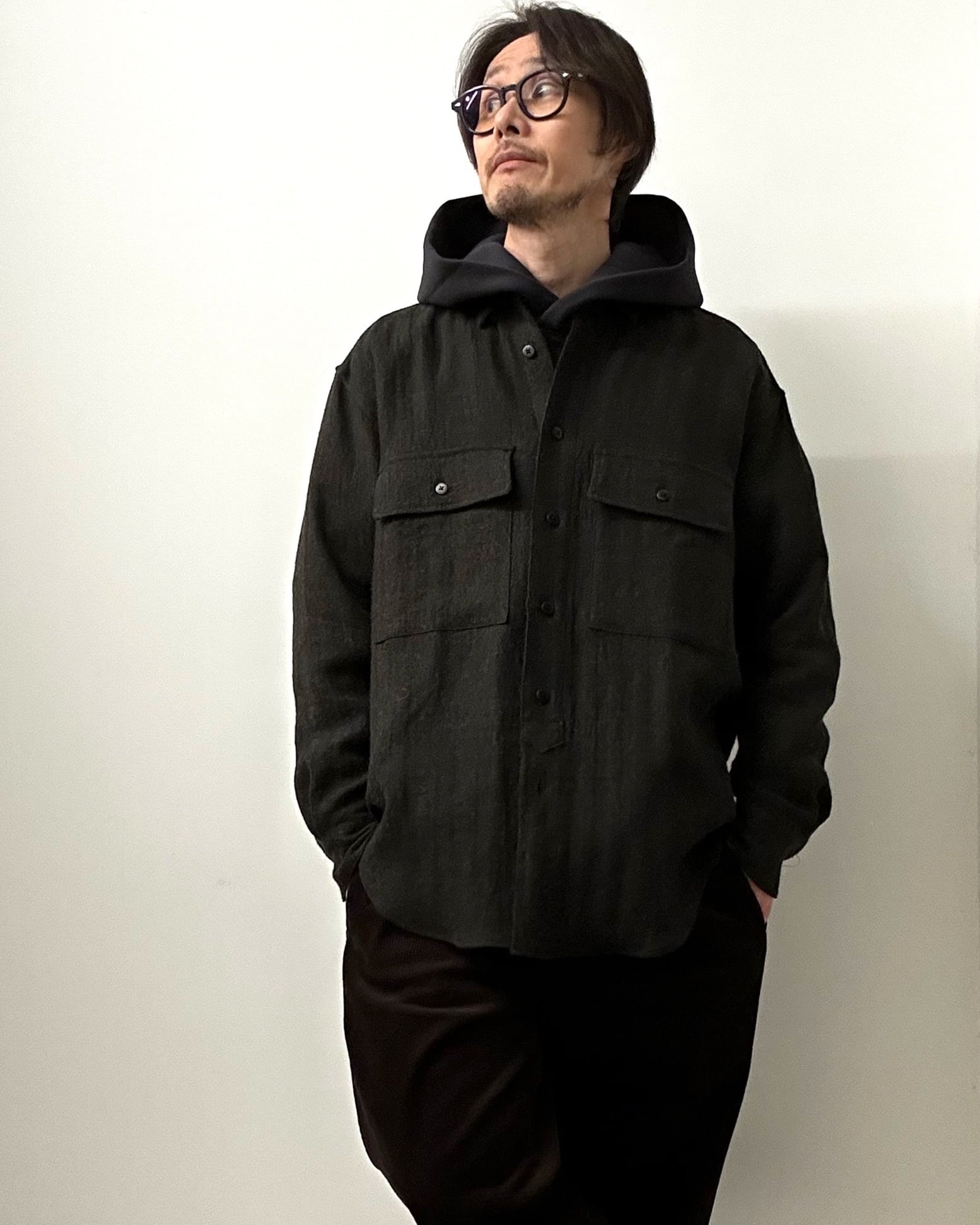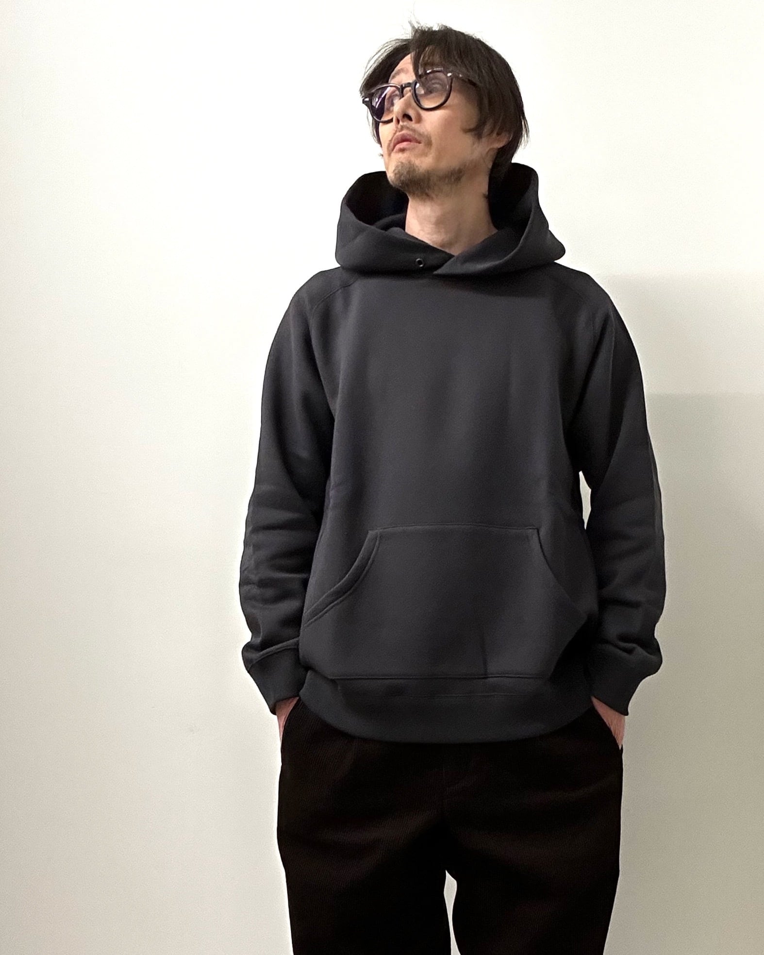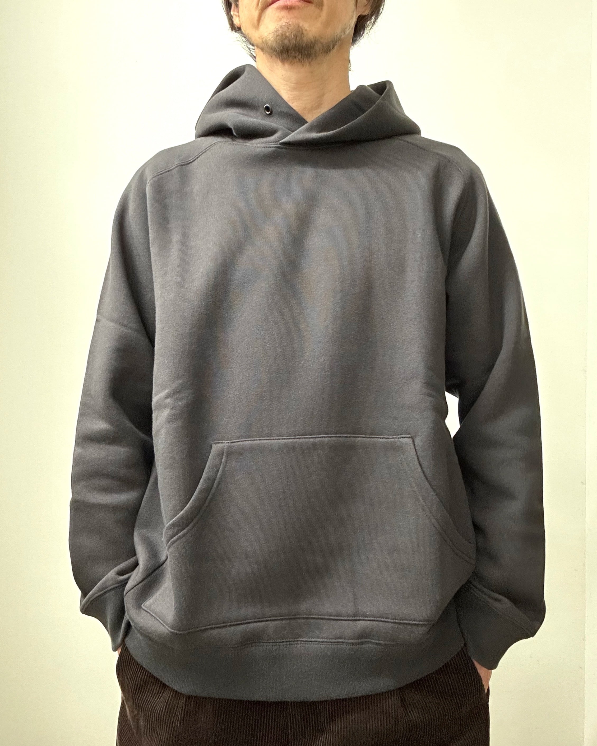 上記の加工を裏側(起毛側)のみに施しました。手触りがまるでシルクかカシミヤのようにサラサラ、モチモチ感じられる、驚きのラグランスリーブパーカとなっております。