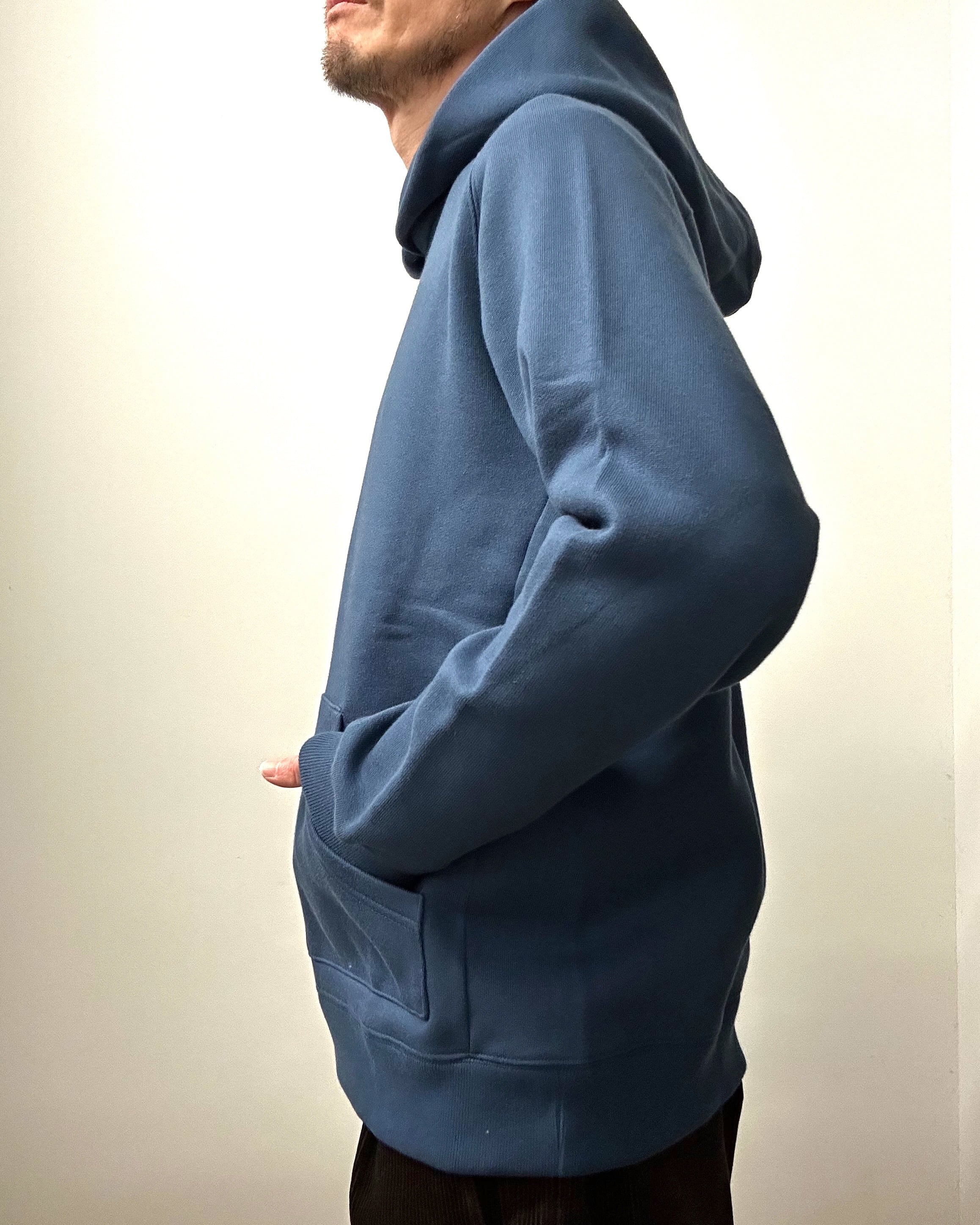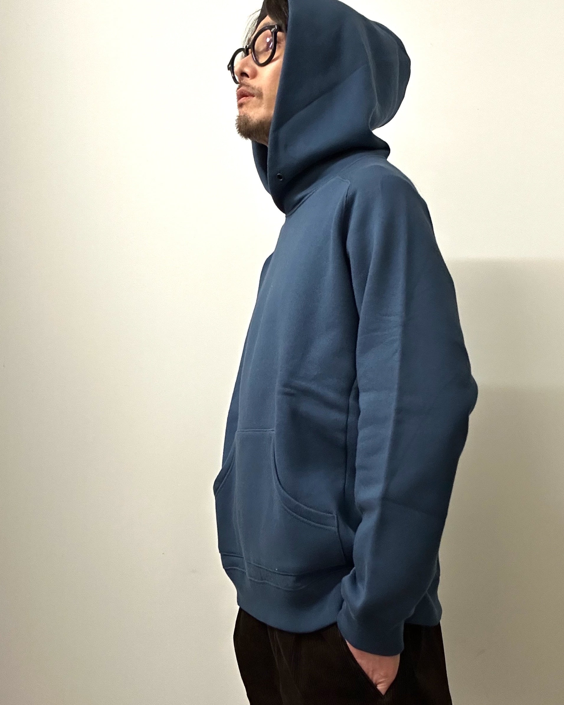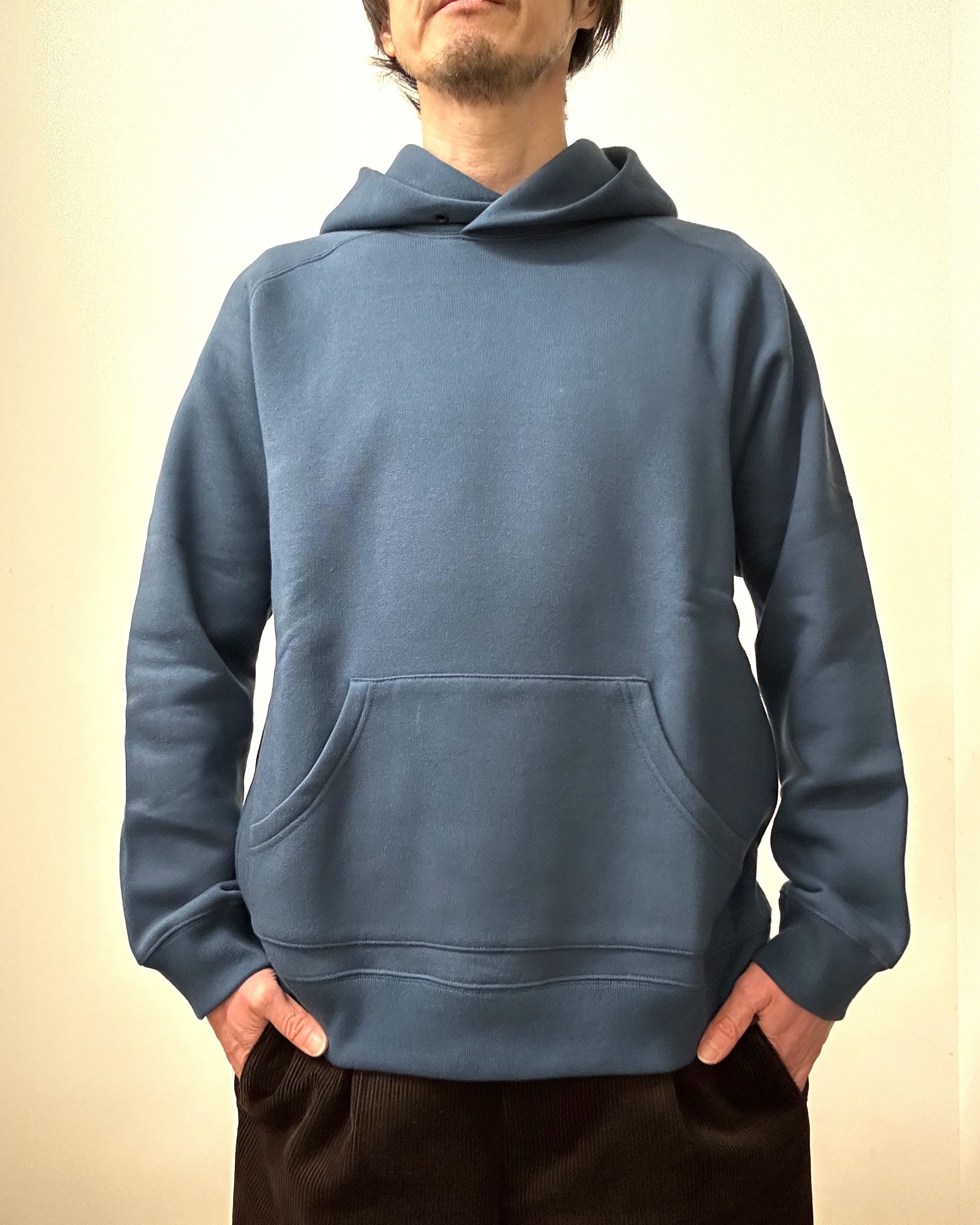 上記の加工を裏側(起毛側)のみに施しました。手触りがまるでシルクかカシミヤのようにサラサラ、モチモチ感じられる、驚きのラグランスリーブパーカとなっております。