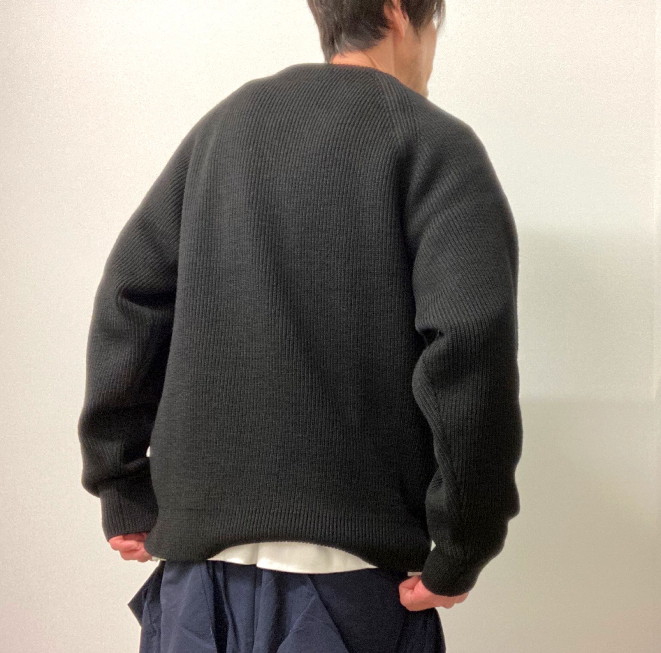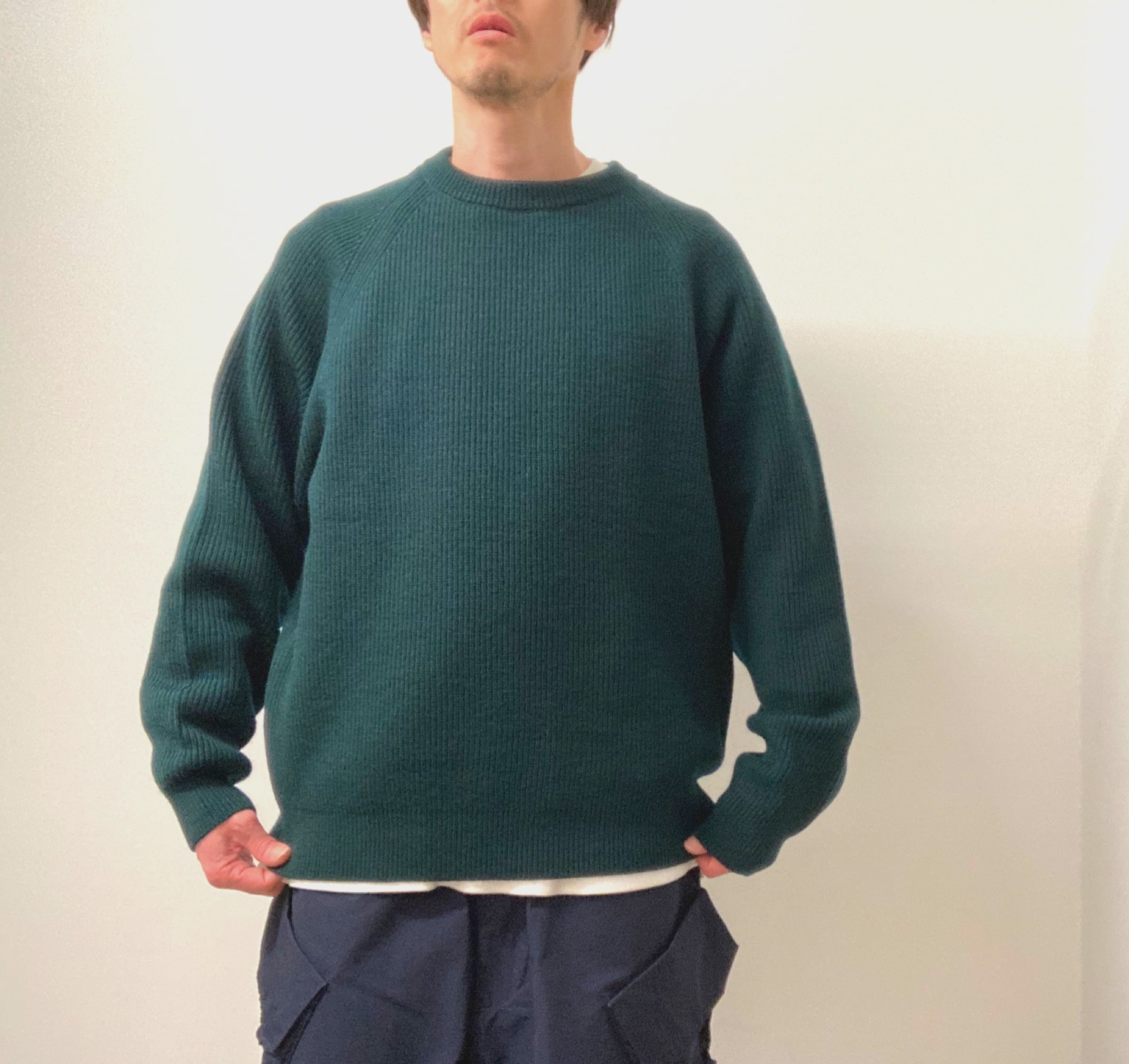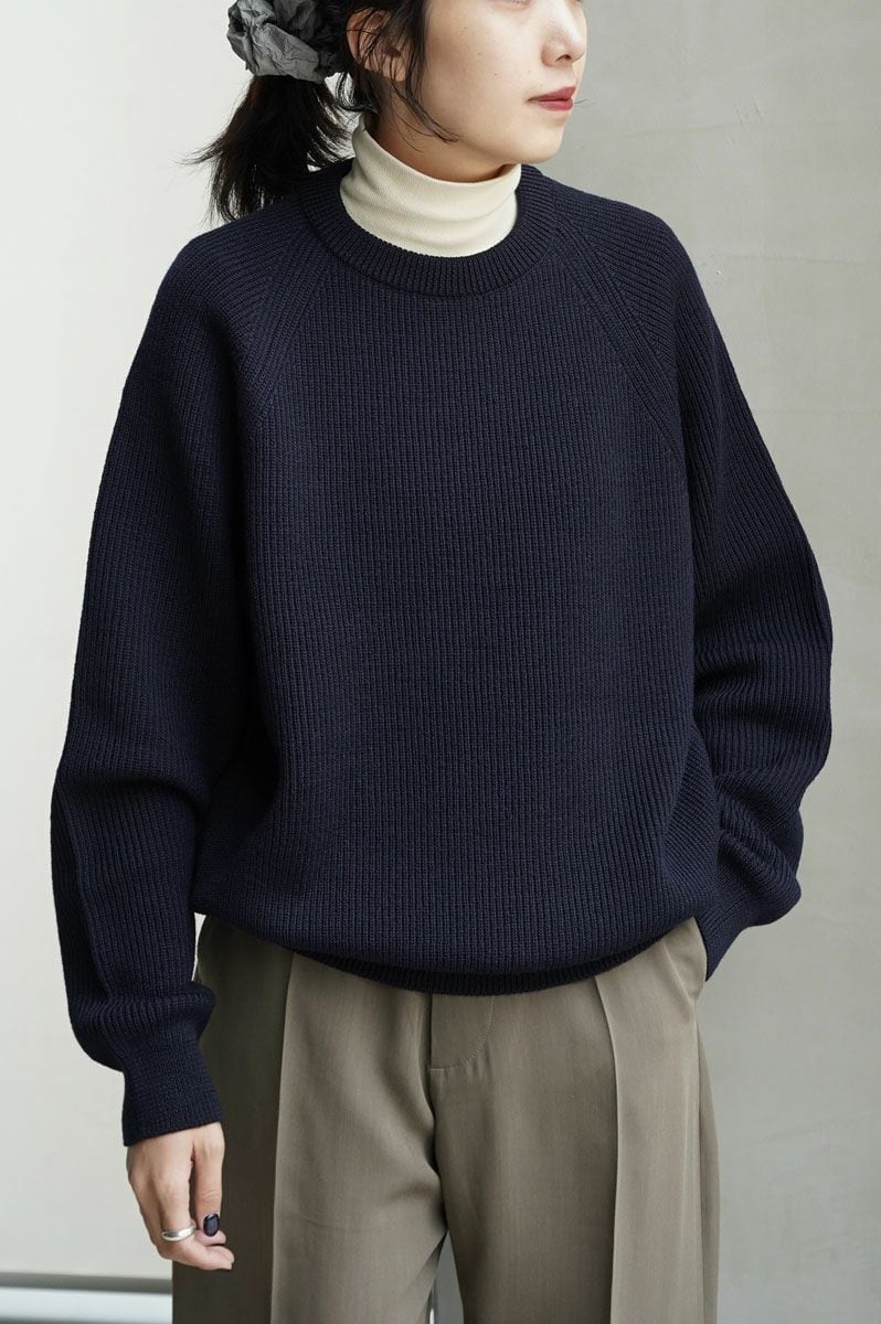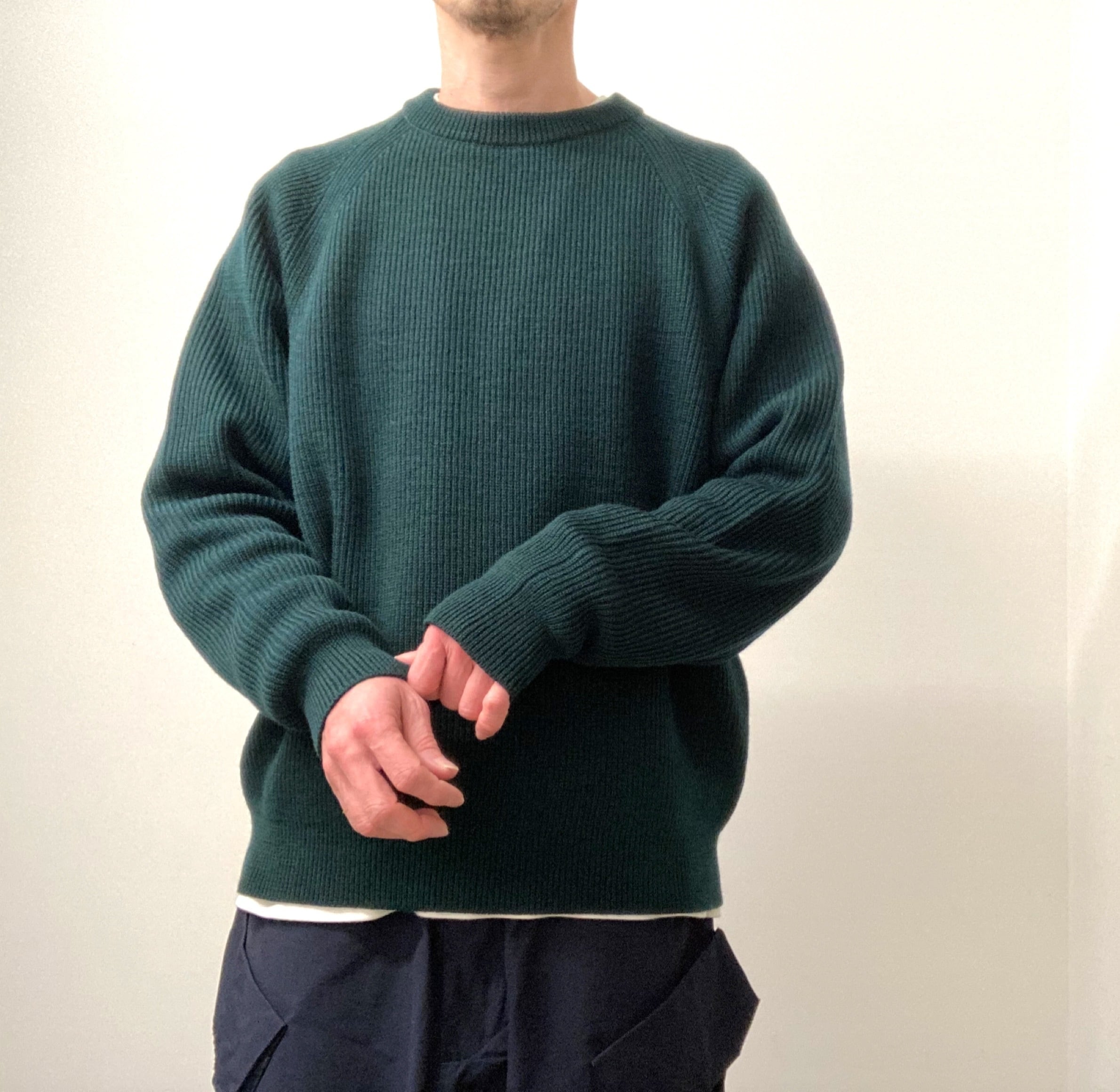メンズ、レディース問わず着用できる弾力のあるリブニットを使用し、ふっくらとしたシルエット。WOOL100%厚手のクルーネックニット。着心地もよく暖かいです。