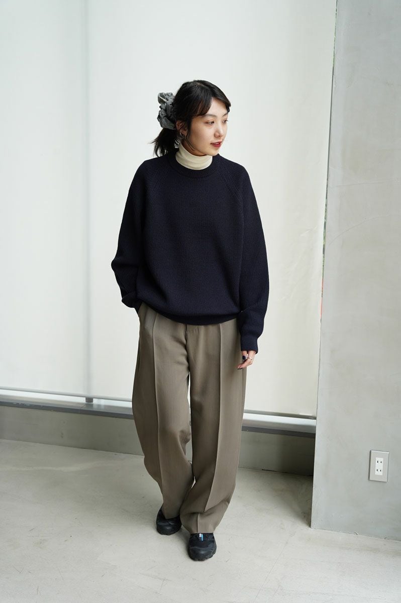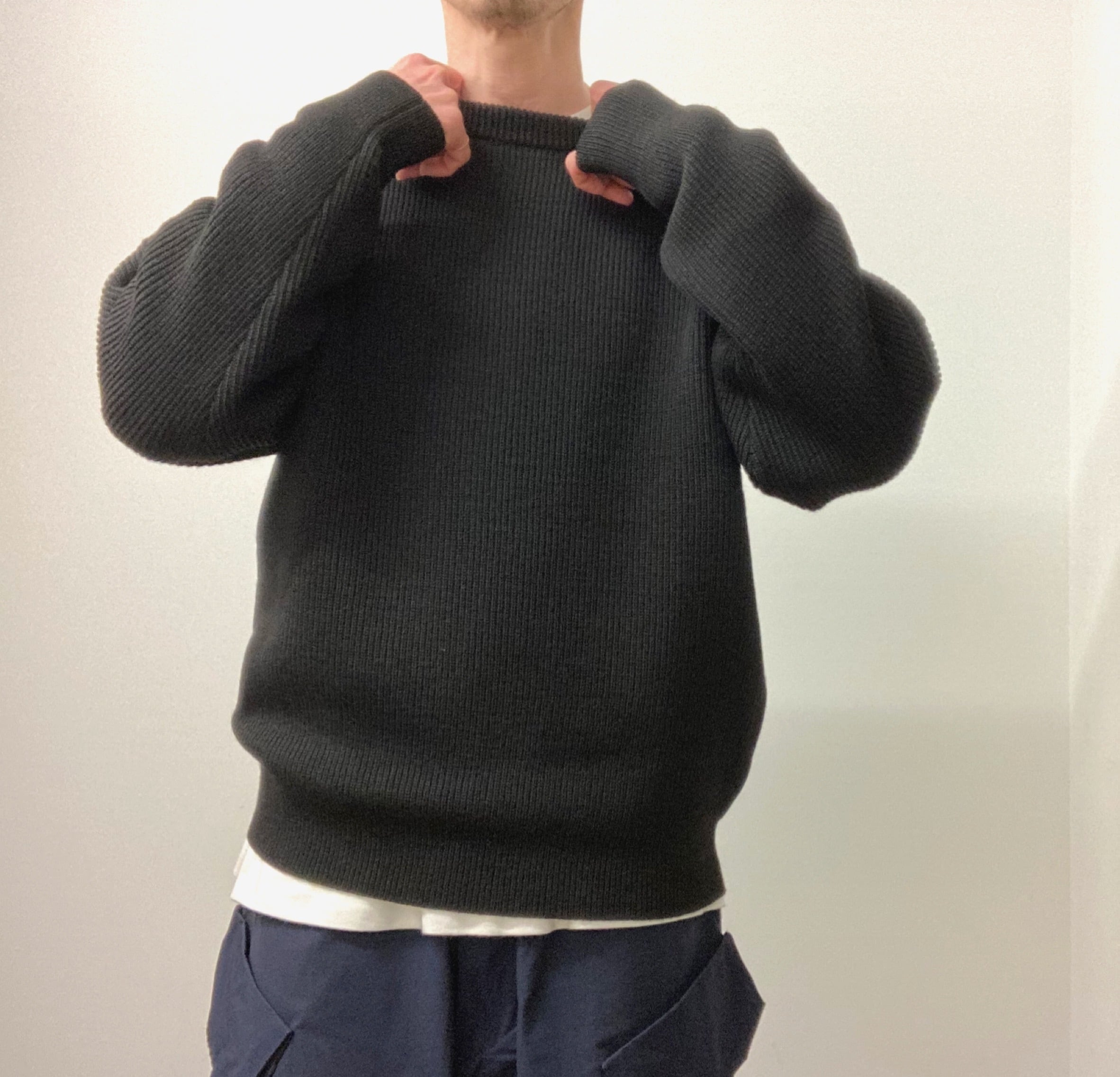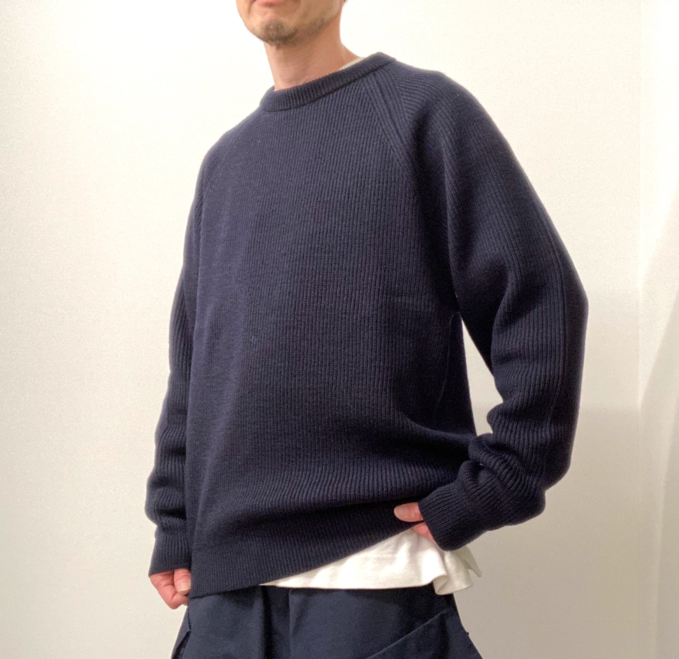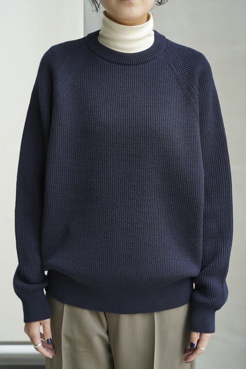 メンズ、レディース問わず着用できる弾力のあるリブニットを使用し、ふっくらとしたシルエット。WOOL100%厚手のクルーネックニット。着心地もよく暖かいです。