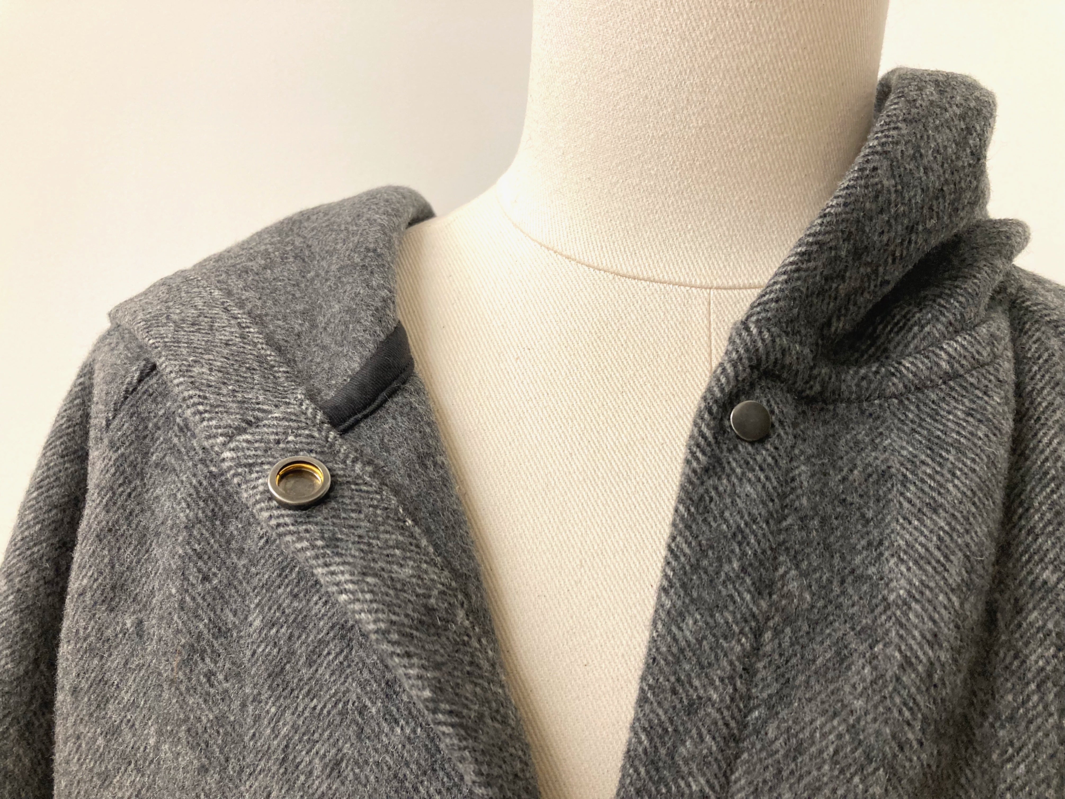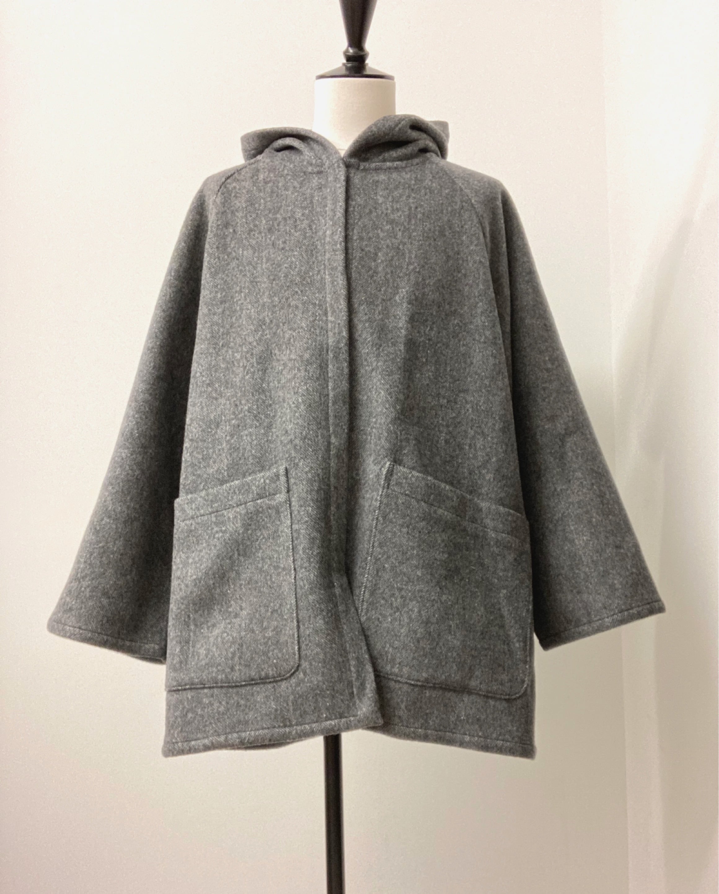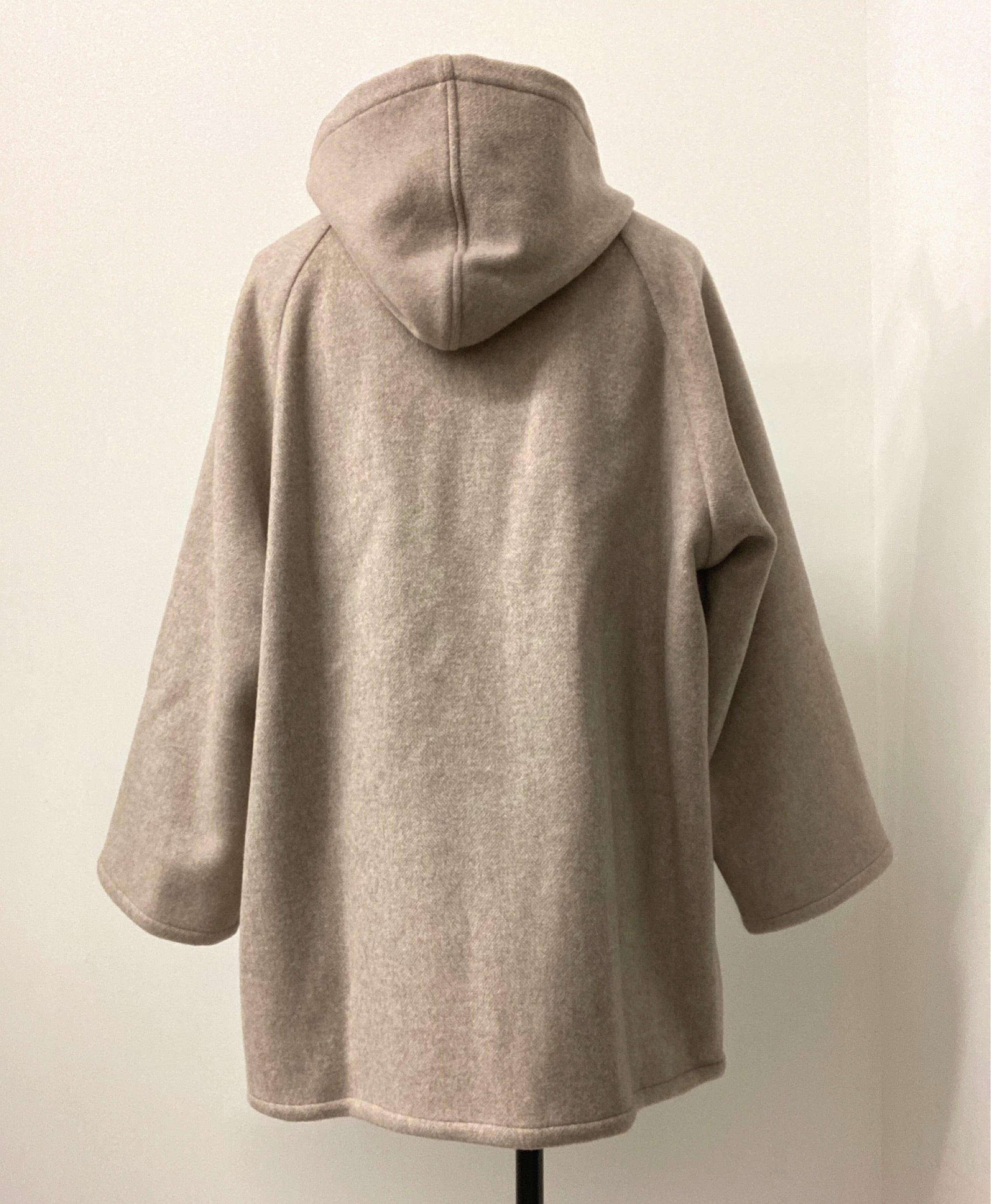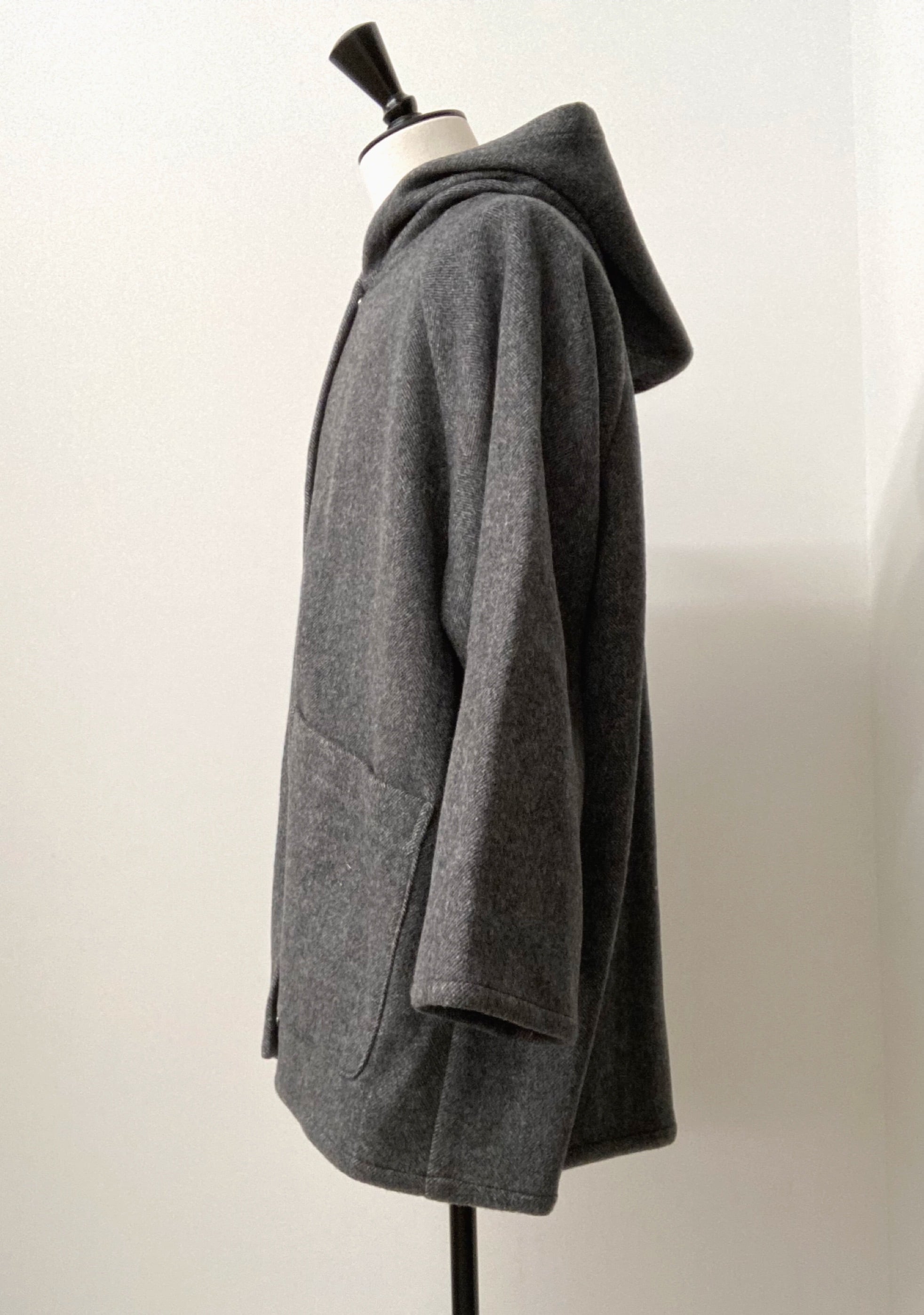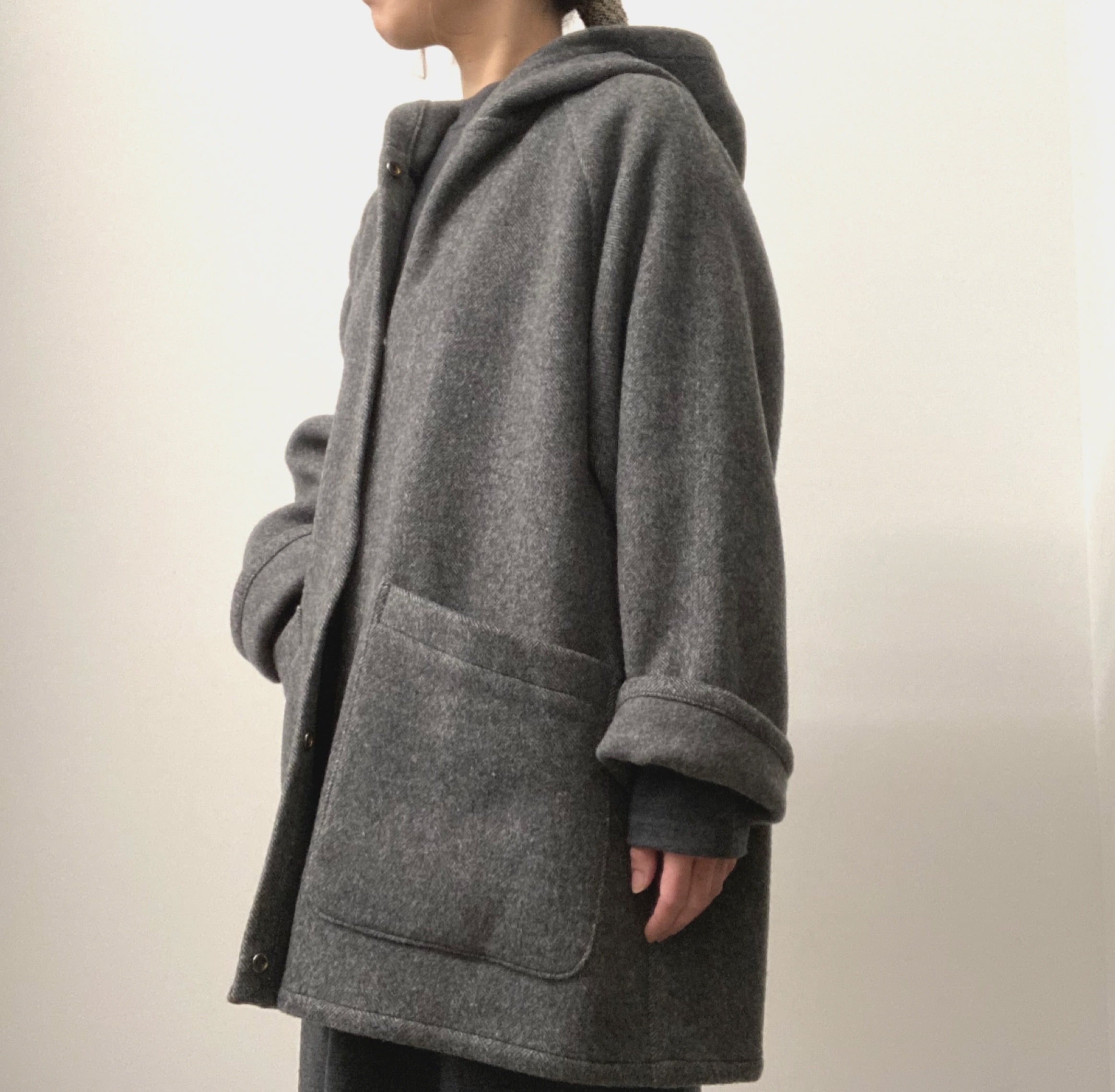 厚みがあるので裏地無し、まるで毛布を着ているかのようなシンプルなフーディーコート。