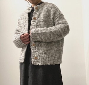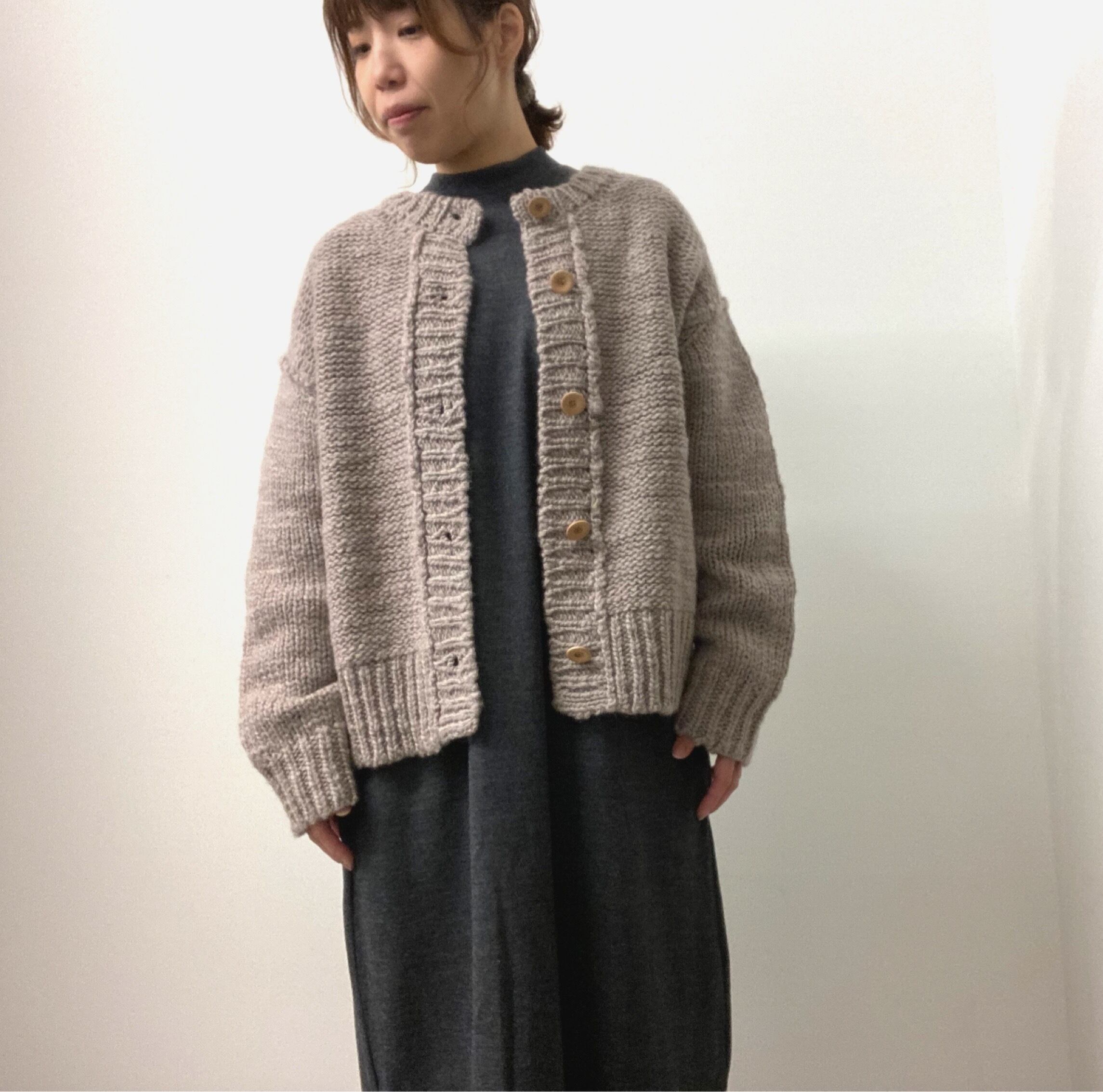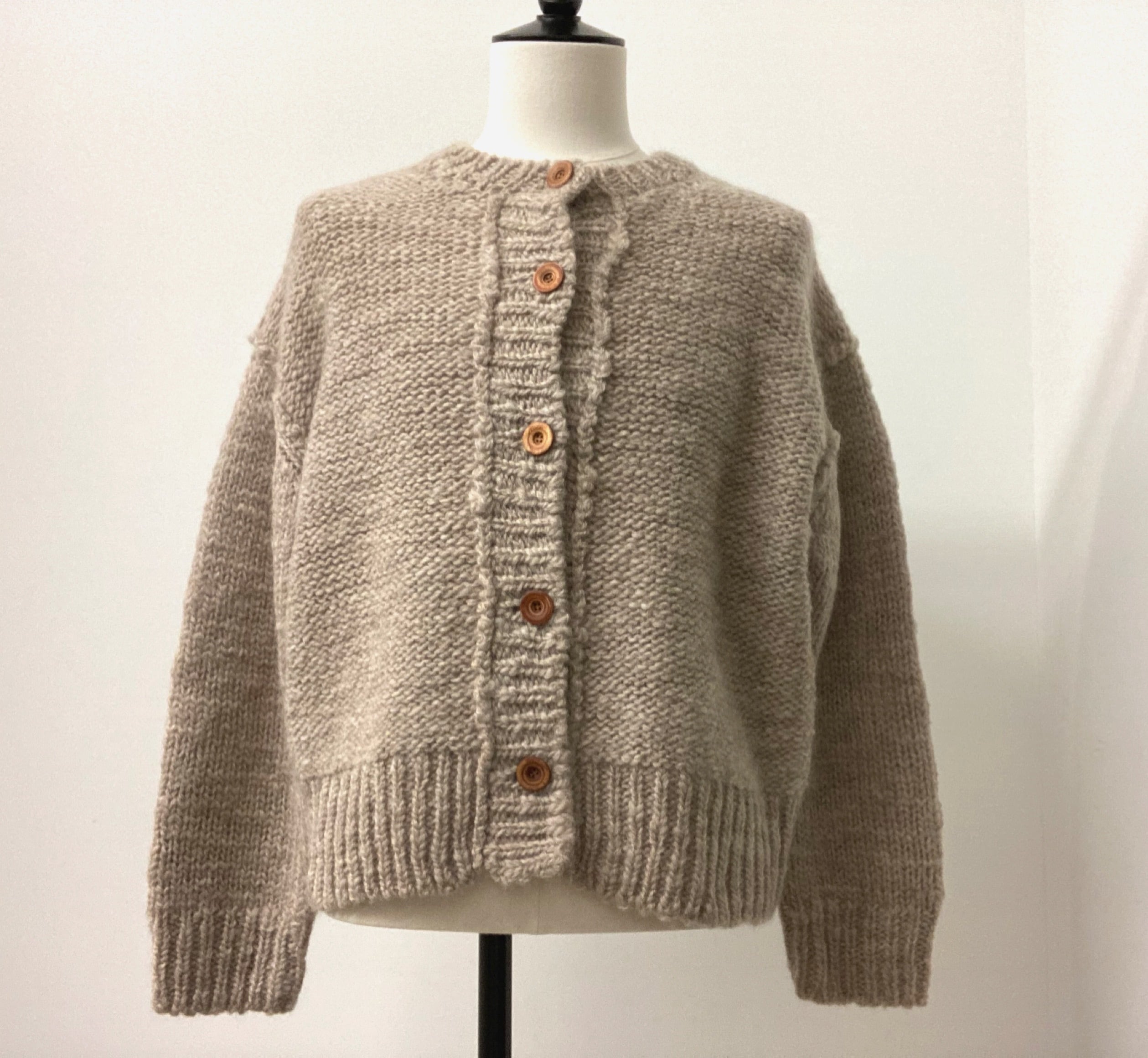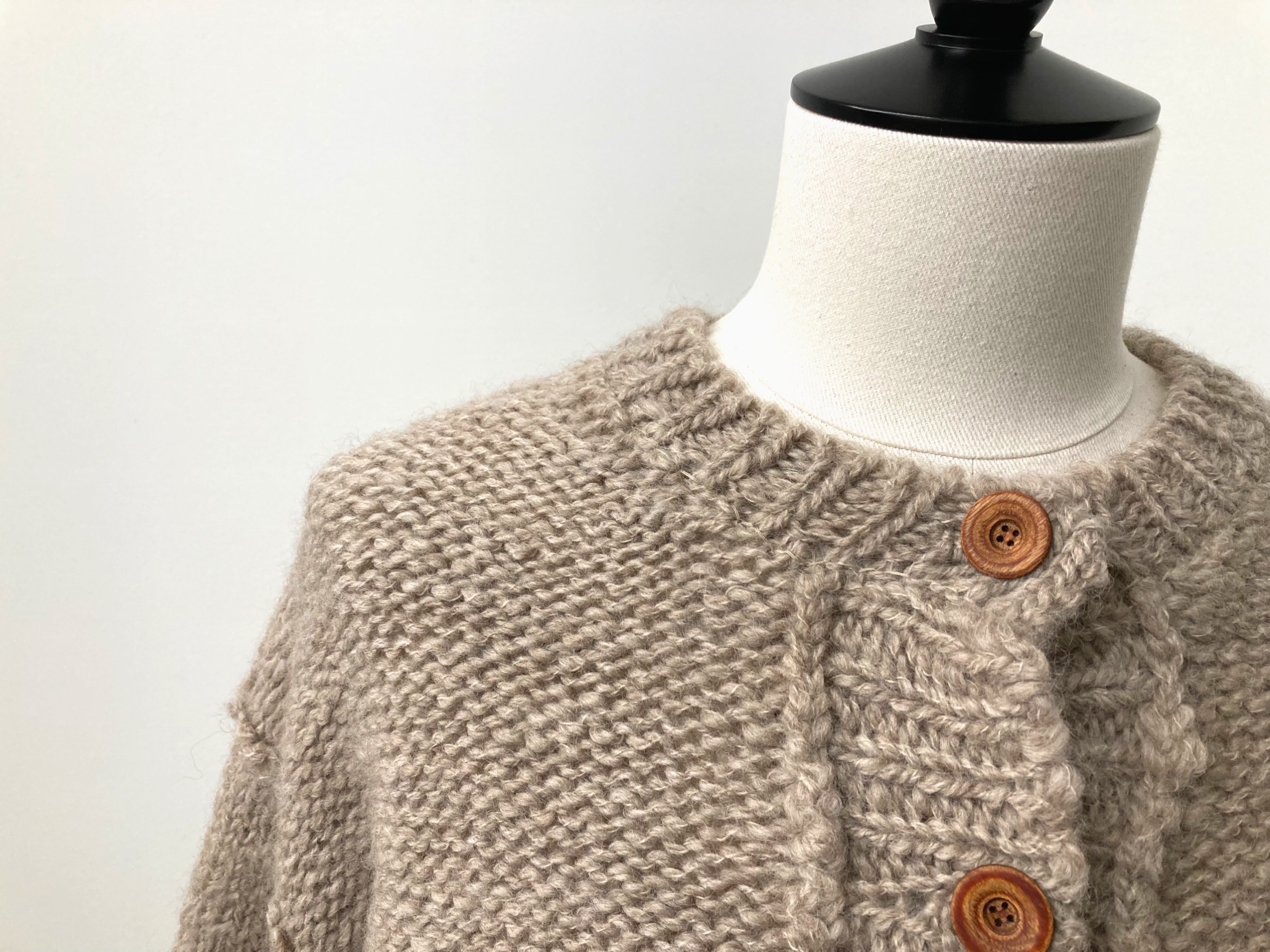 手編みにも使用されるくらいの太い番手で、手横編み機でも衣類を製作するのに一番ローゲージの1.5ゲージで製作。特徴的なウッドボタンを使用しております。