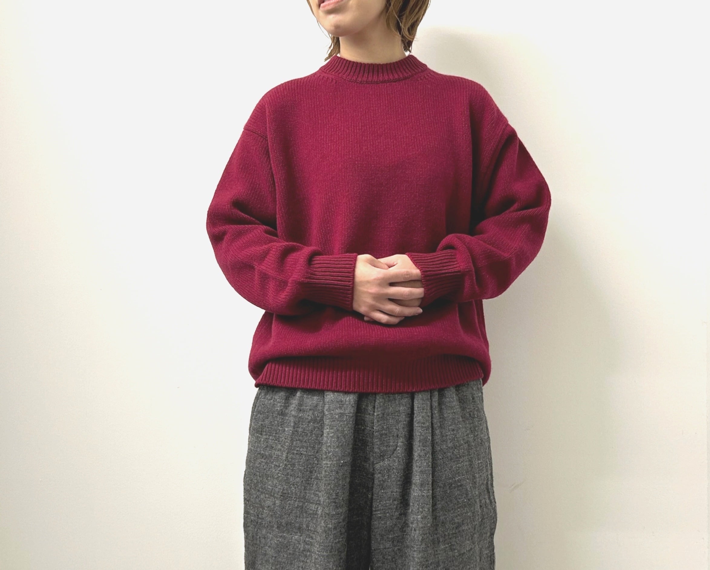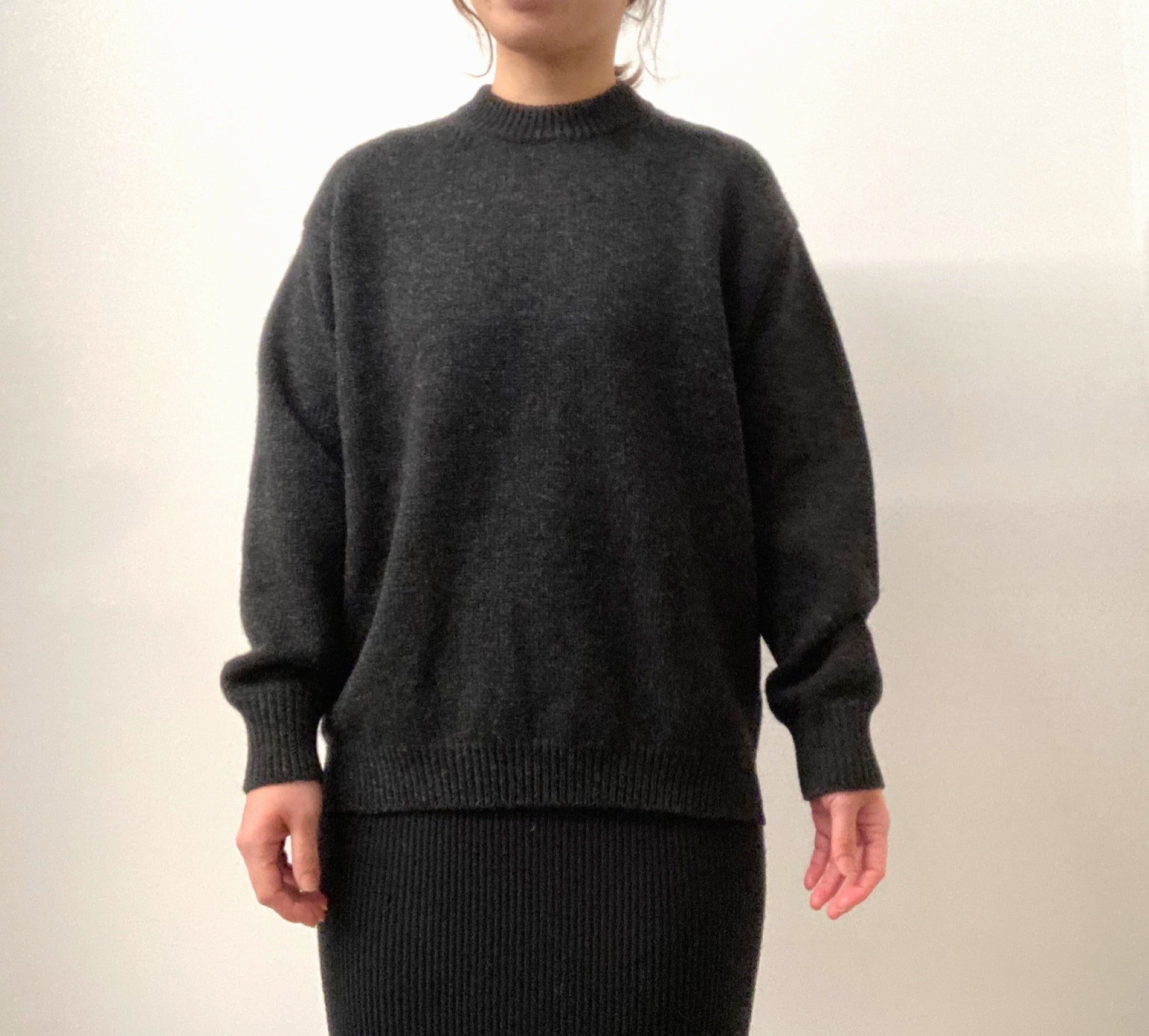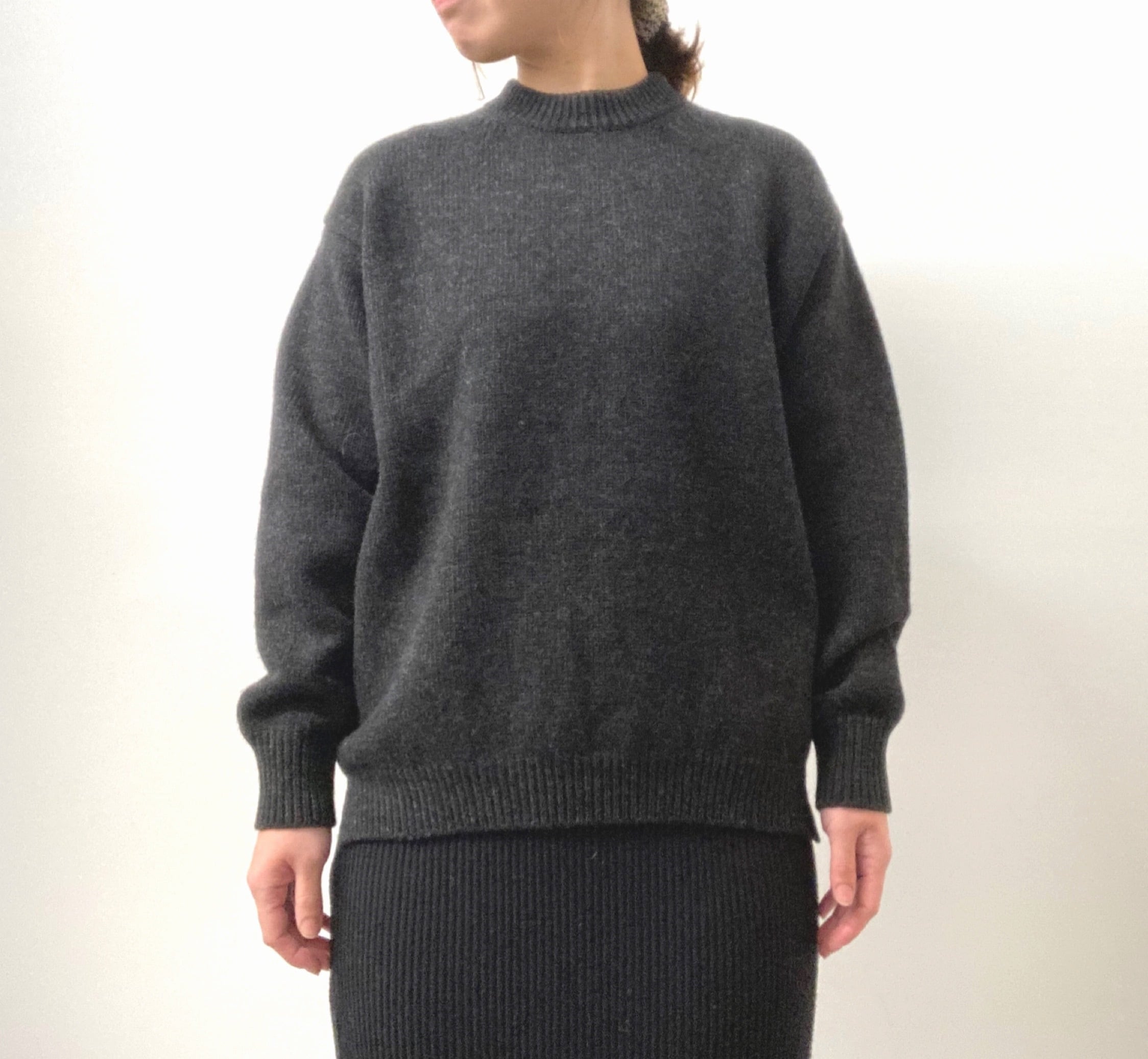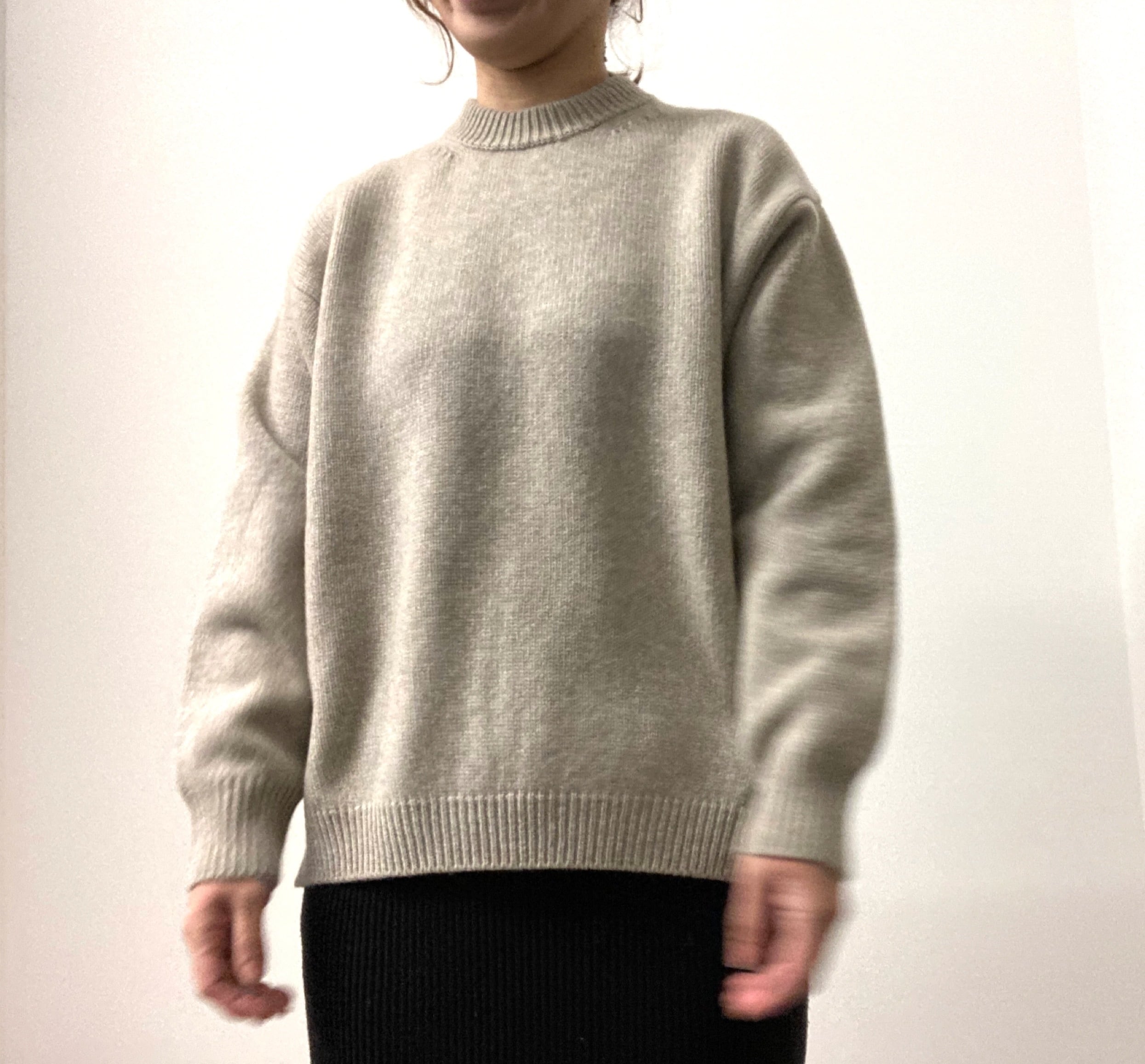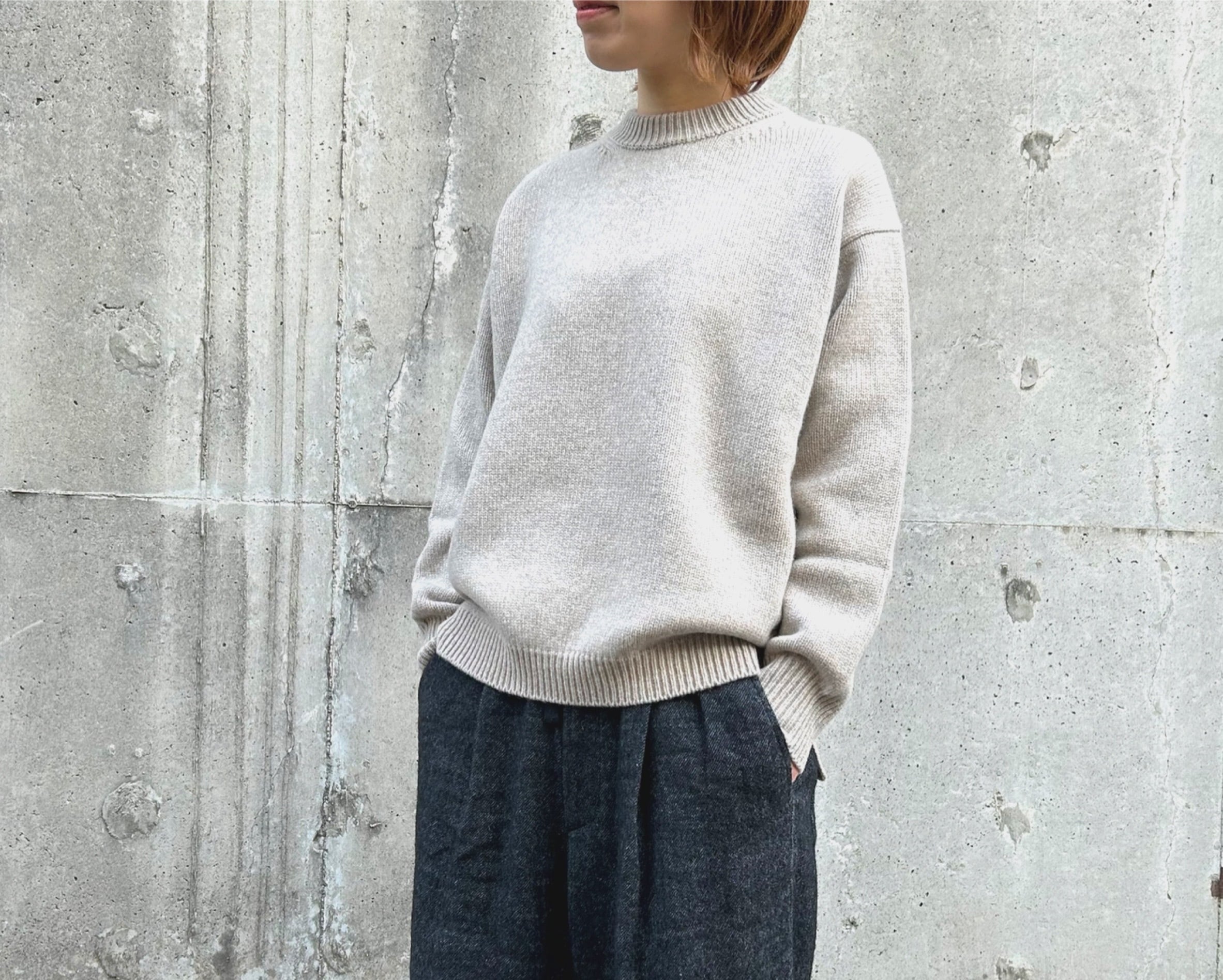 軽さ、ソフトで弾力性のある膨らみなど、バランスの良い糸を、東北の手横編み機職人に時間をかけて編んでいます。ネック部分は、モックネック仕様で若干高めになっており首元の肌触りも良く暖かいです。レディースニットとしては、かなりゆったりと着て頂けるサイズ感となっています。