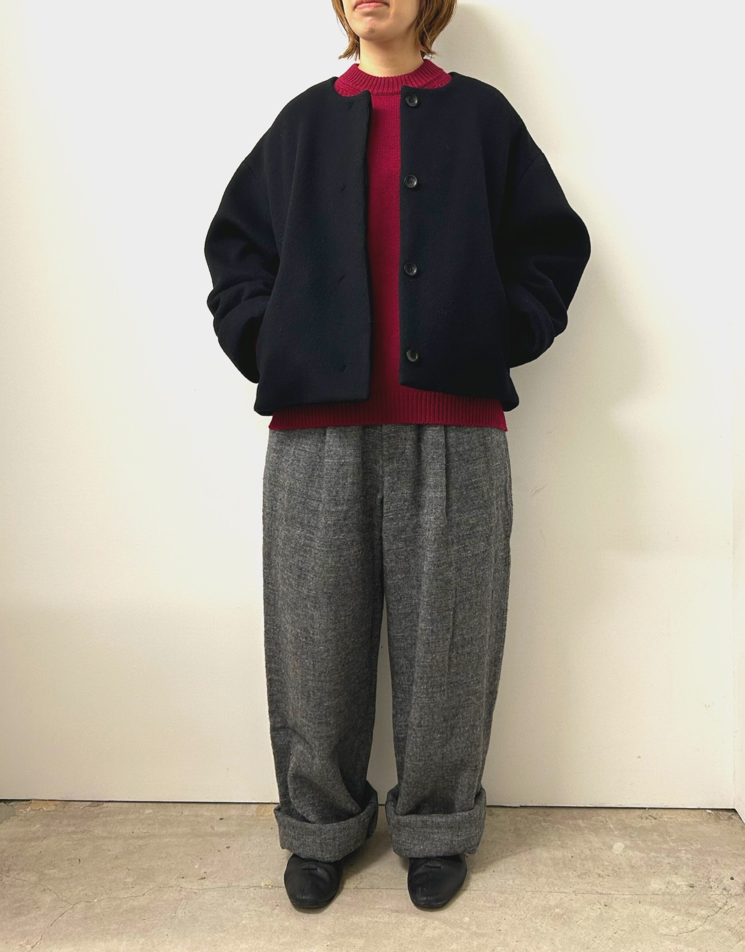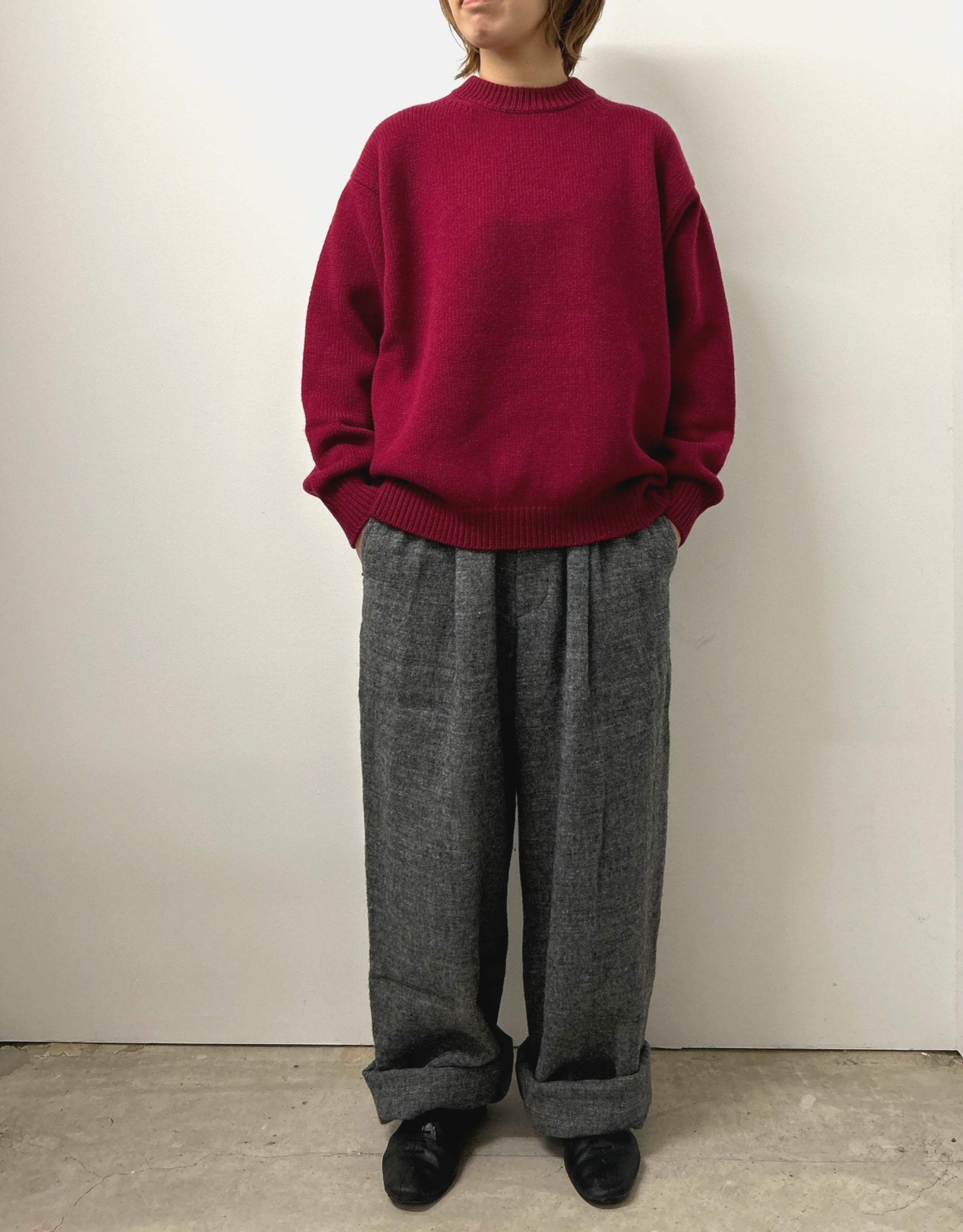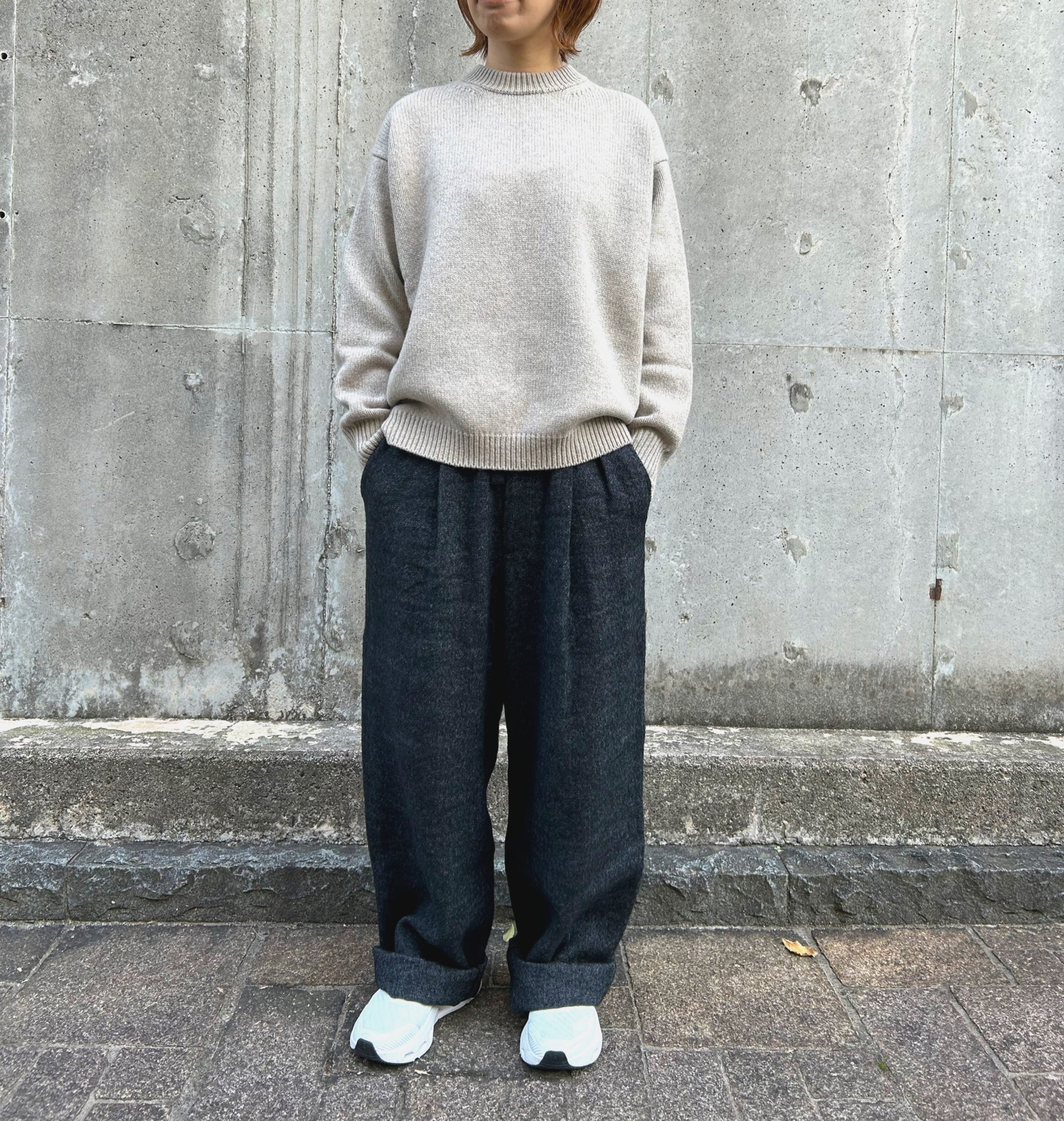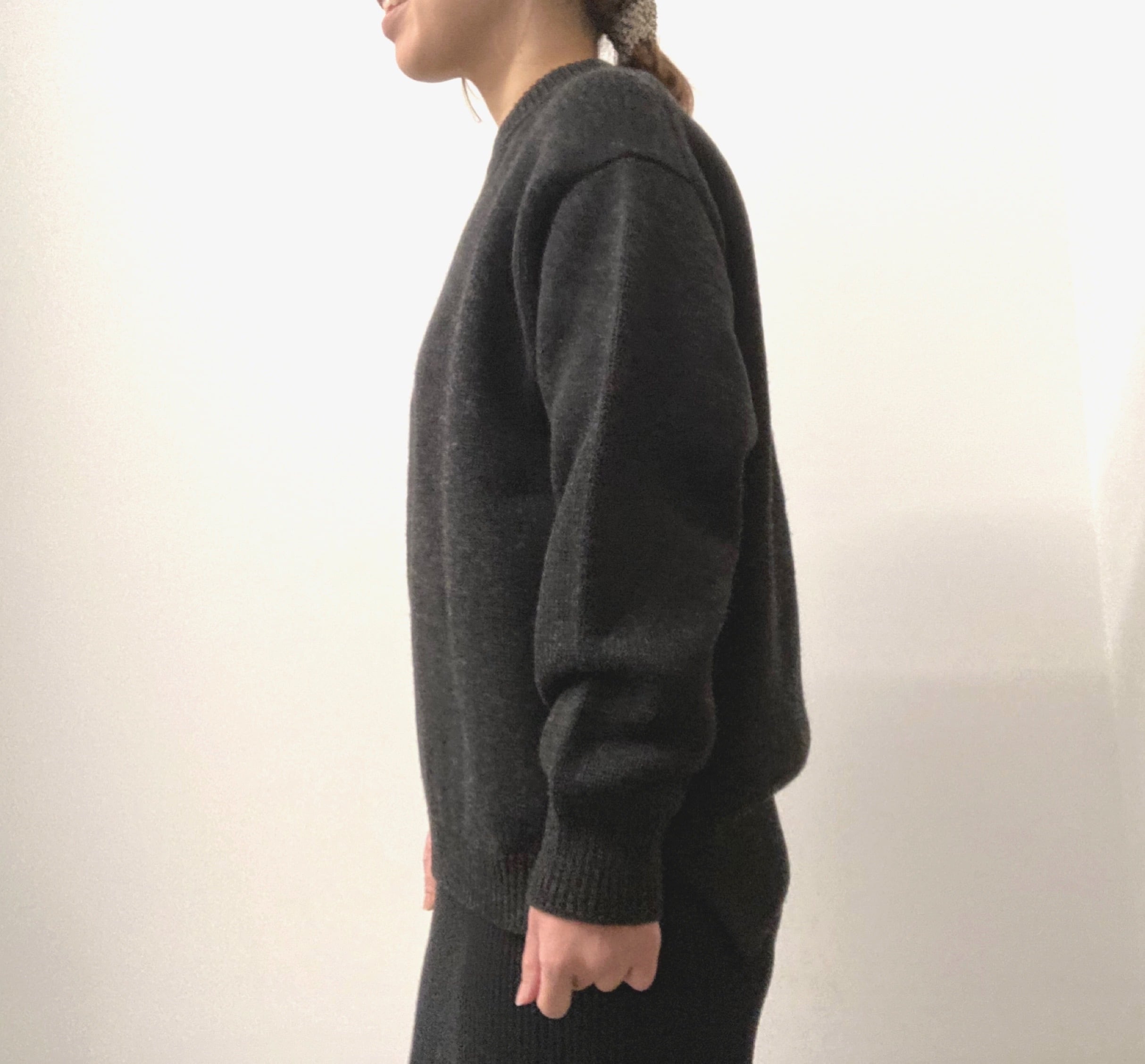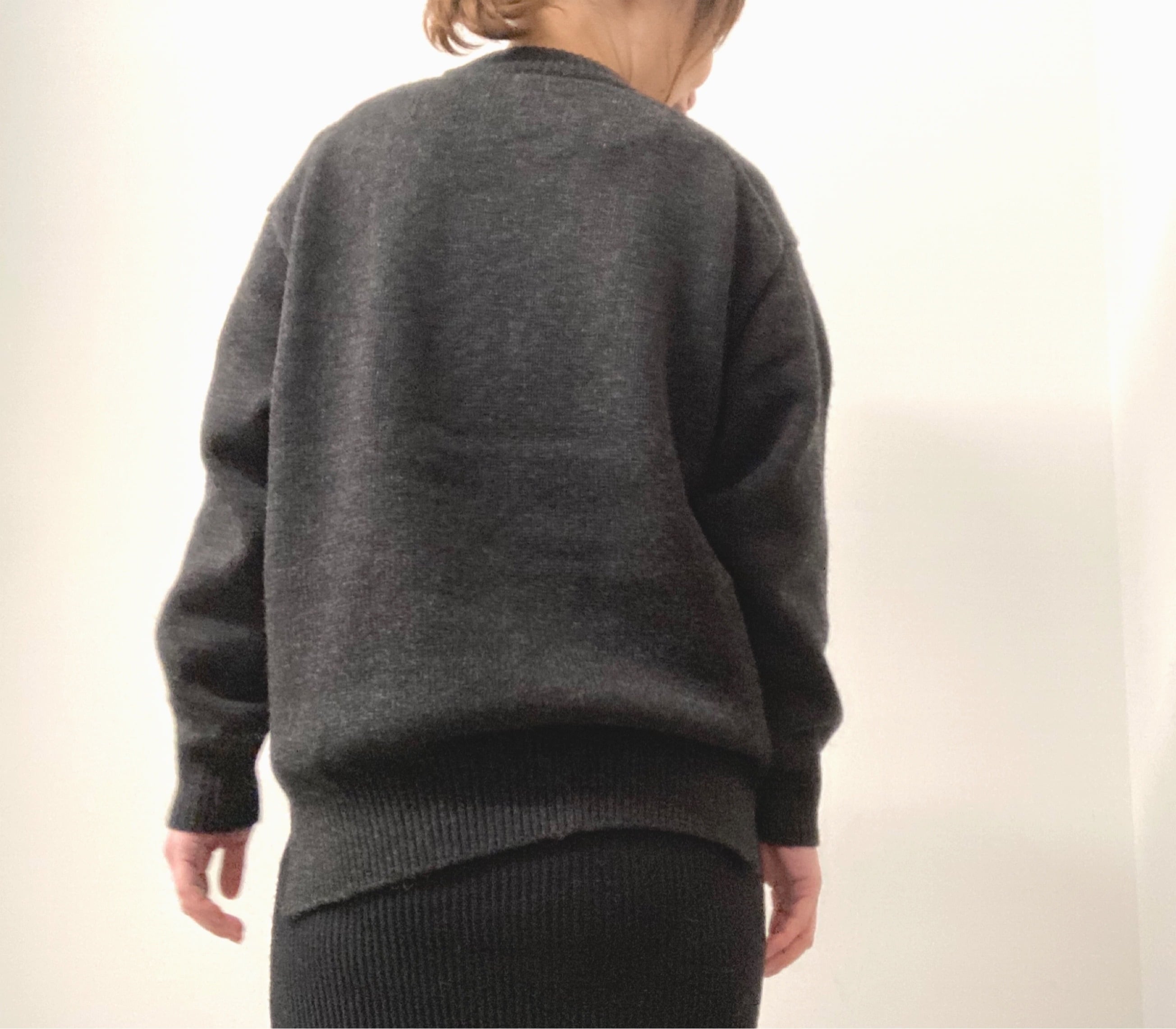 軽さ、ソフトで弾力性のある膨らみなど、バランスの良い糸を、東北の手横編み機職人に時間をかけて編んでいます。ネック部分は、モックネック仕様で若干高めになっており首元の肌触りも良く暖かいです。レディースニットとしては、かなりゆったりと着て頂けるサイズ感となっています。