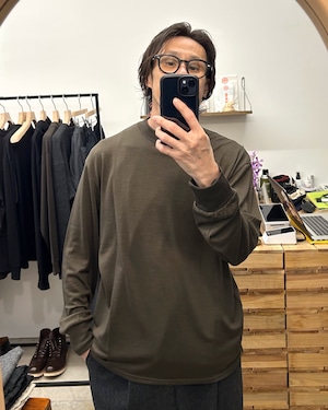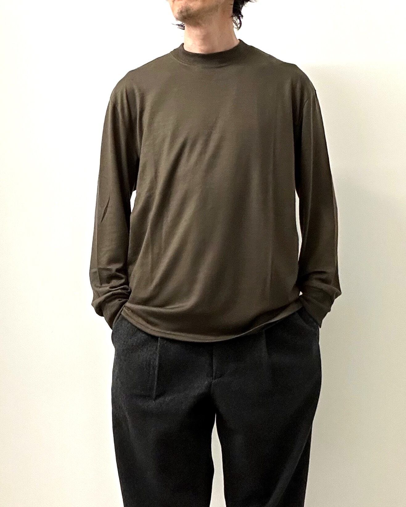 Super 100's (18.5マイクロン)というスーパーファインメリノといわれる極細繊維の素材をジャージー生地用に超極細番手に梳いた梳毛糸を使用して編み上げた、とても豪華なウールインナーカットソーです。