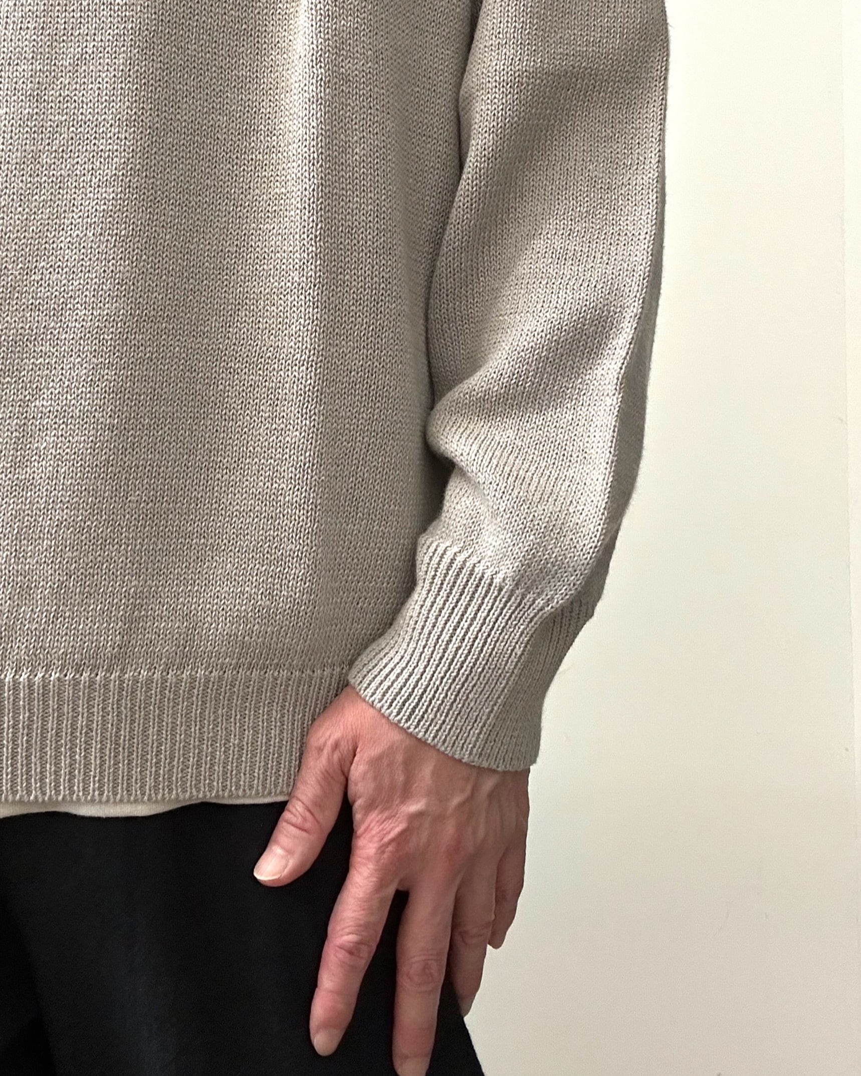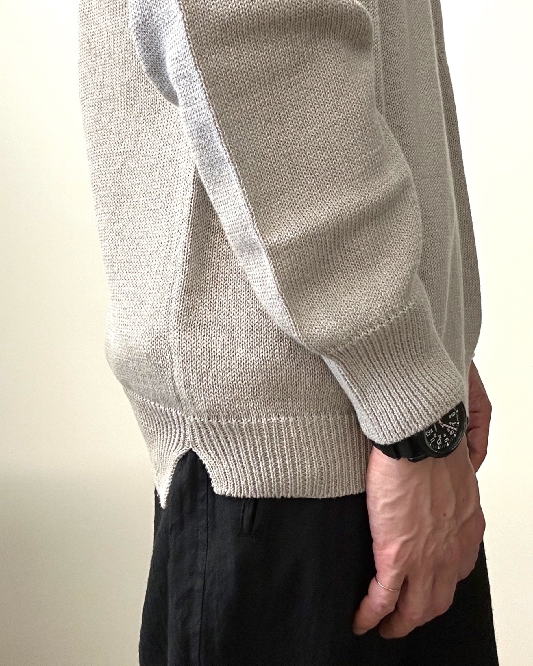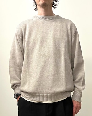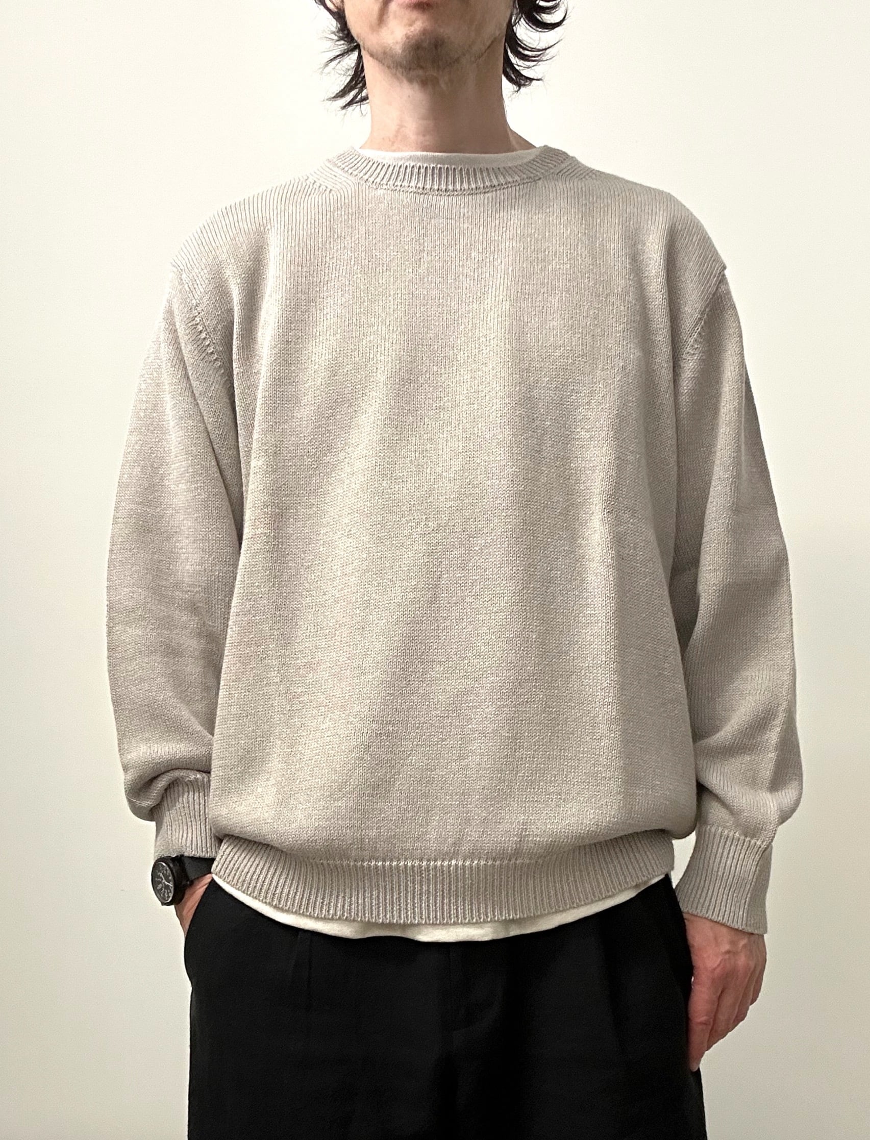 東北地方で現存する、貴重な手横編み機職人に時間をかけて綿麻素材のゆったりとしたニットプルオーバーを作製。