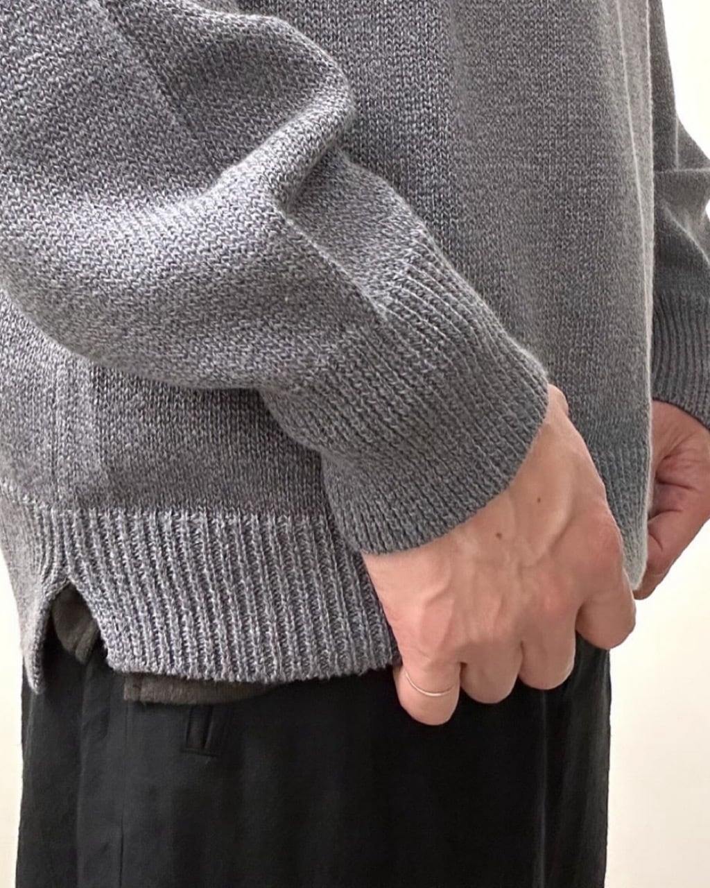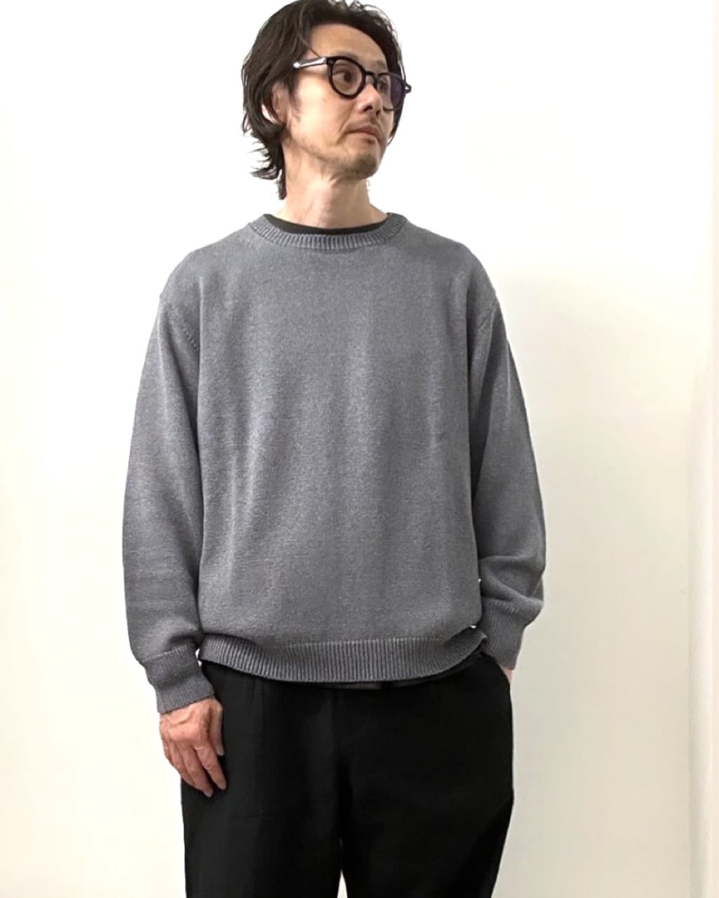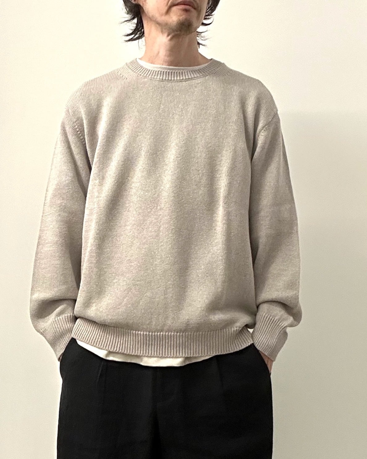 東北地方で現存する、貴重な手横編み機職人に時間をかけて綿麻素材のゆったりとしたニットプルオーバーを作製。